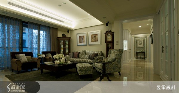 客廳沙發背牆依古典對稱原則等比例加寬,即使擺放沙發之後,兩側還有餘裕可擺放展示櫃及立鐘。走道則保留行走所需寬度,以美式方形拱門框設計,呼應盡頭處的端景,增添空間景深與美感。