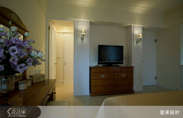 主臥電視牆面採內縮式電視櫃,向兩側延伸則是主臥門片與更衣室門片的對稱設計,不但更衣室內的空間及動線完全不受影響,正發揮了空間的最大使用坪效。