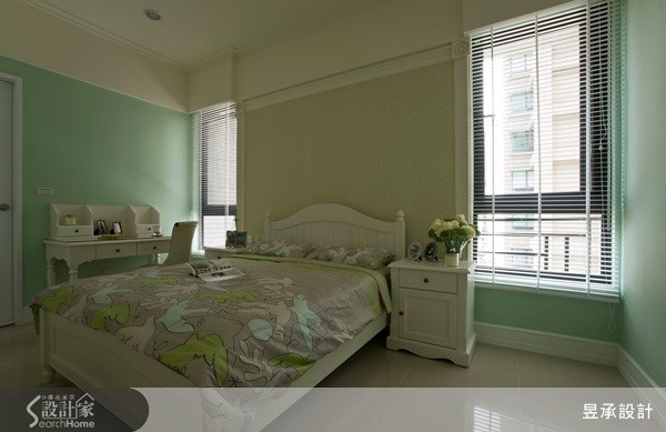 綠色系的男孩房,採用與主臥室相同的設計手法,以壁板封住過大的窗戶做為床頭主牆,兩側更以百葉窗保留室內採光外,更營造純然美式的臥室風華。