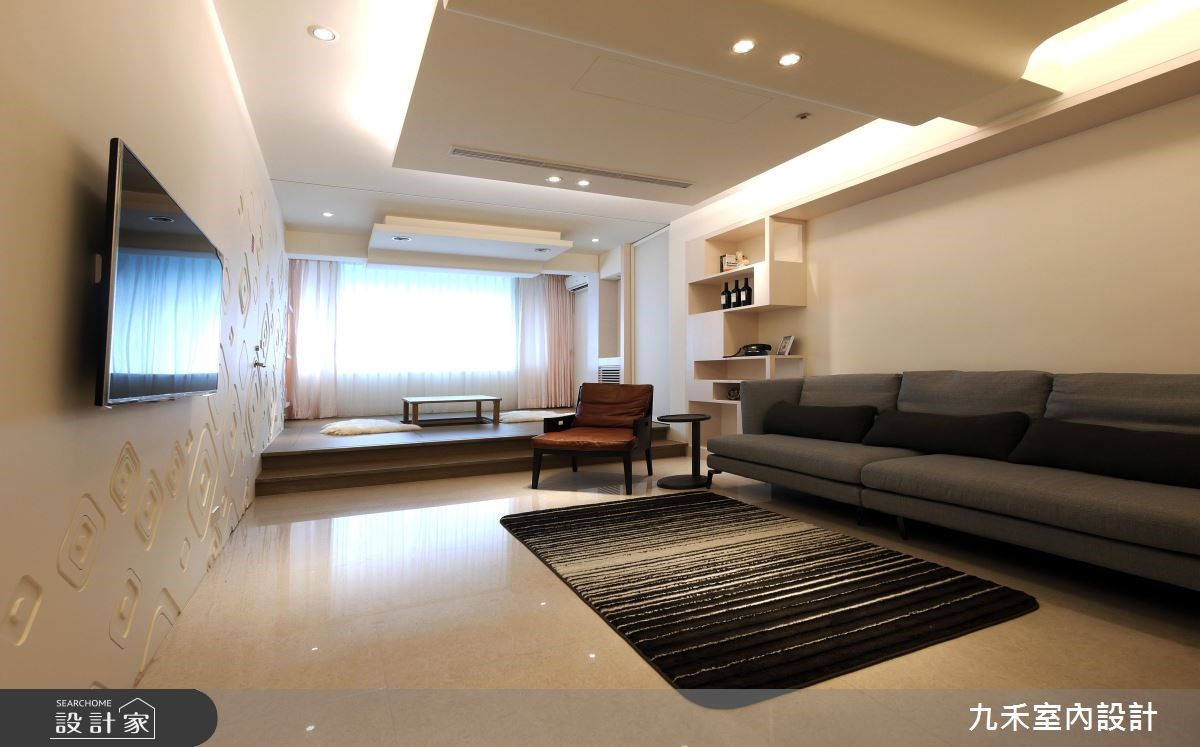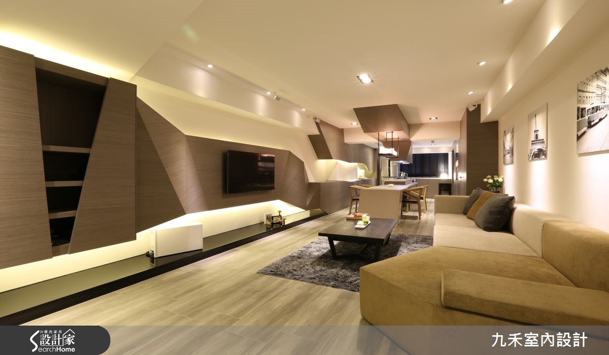 客厅以挑高方式处理,藉大面落地窗引进满园绿意,如同镶嵌一幅风景画,开阔了生活空间与视野。大地色系沙发与灰褐色大理石地板,则柔