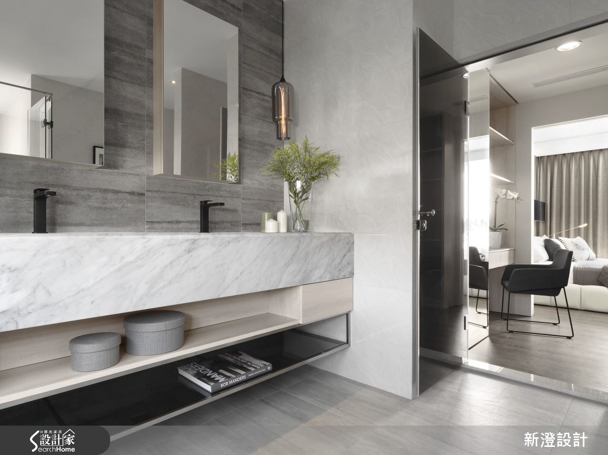 设计师为三口之家所打造的165平方米的预售屋,利用石材纹理与镜面反射效果,打造深浅交织的优雅形象,达成大量复合材质与色调的和谐运
