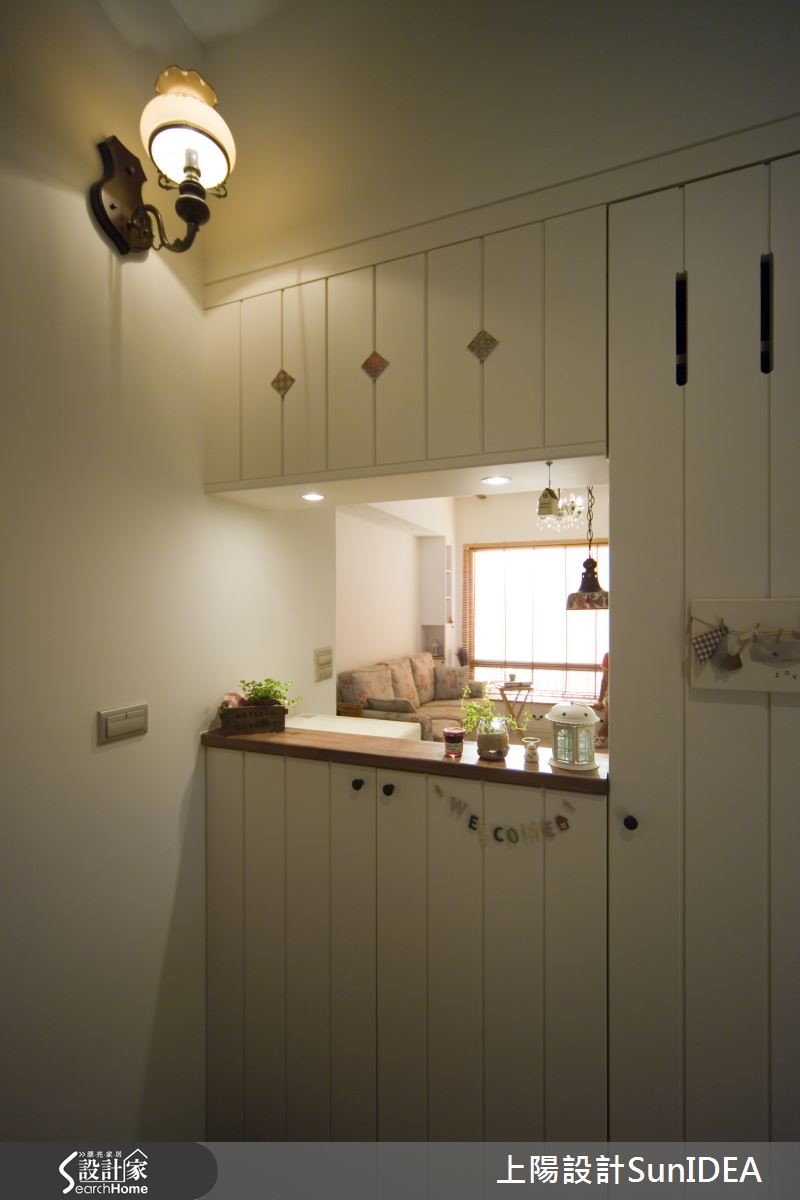 66平方米乡村宅,设计师加入硅璪泥、柚木等建材,营造清新健康的生活环境。【咖啡色复古砖为乡村风完美妆点】玄关以咖啡色复古砖铺陈