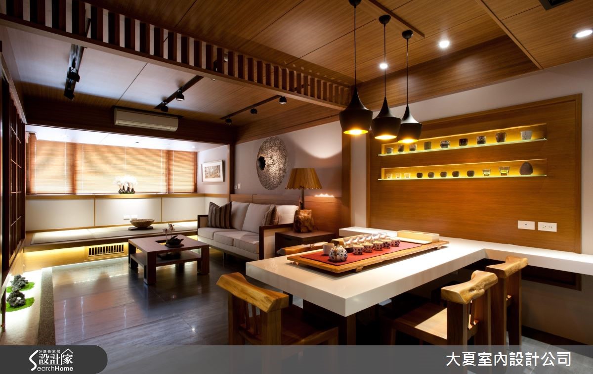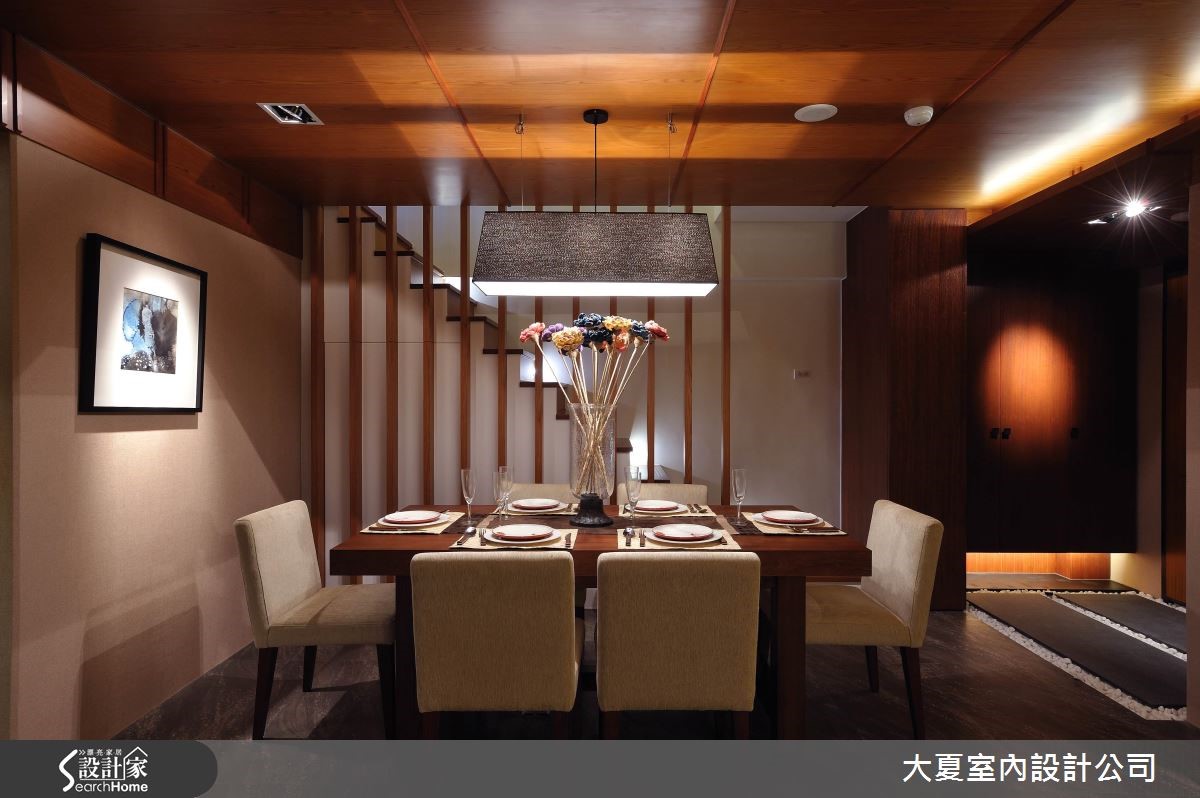 由于屋主偏好沉稳雅致的风格,因此引入日系禅风的特色,藉由自然的元素铺陈空间,深色调的石材和木质堆叠,搭佐间接照明的投射,形塑