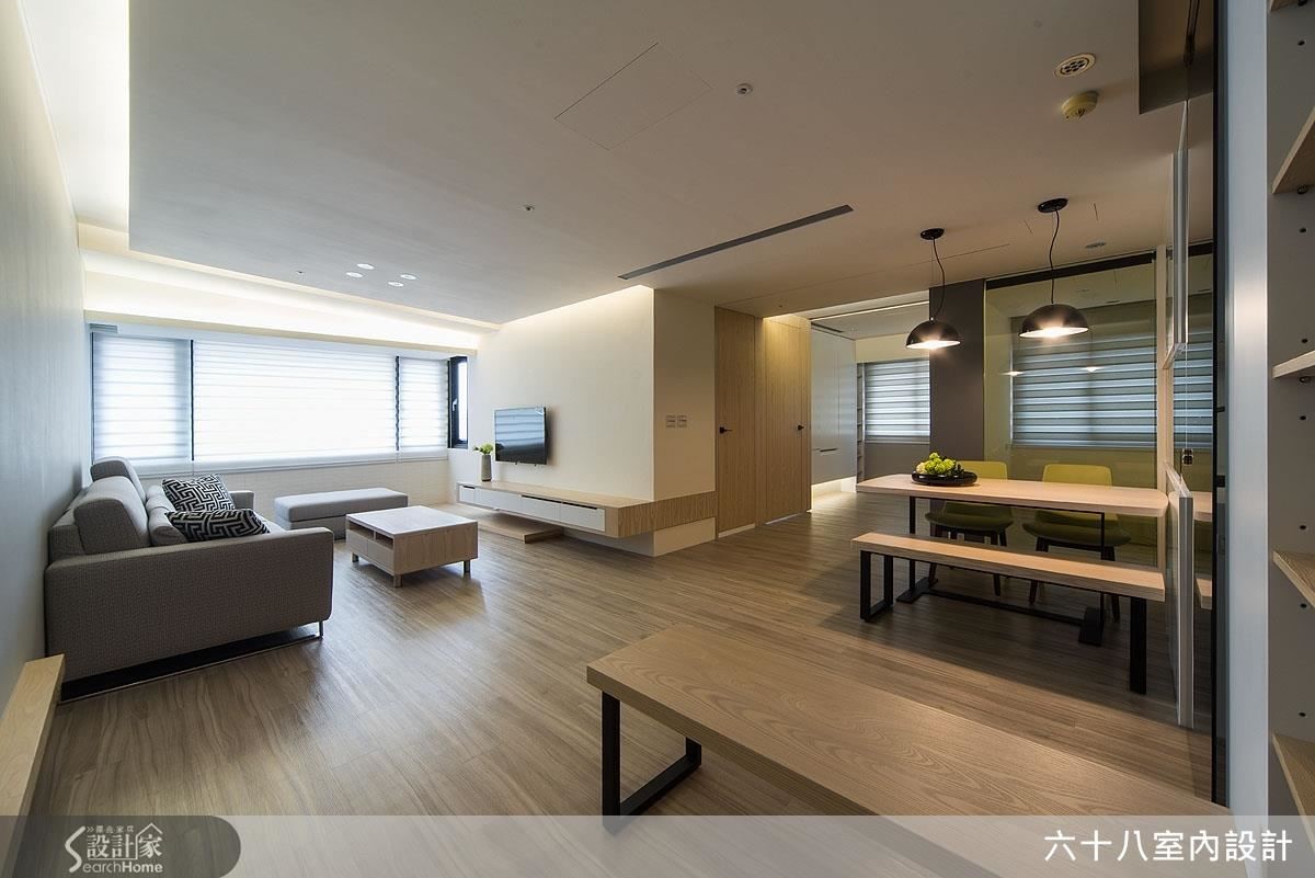 位于高楼层的本案拥有景致优势,屋主十分喜欢窗外的风景,在与设计师合作时,便提出希望能降低空间彩度,让蓝天绿树成为生活主角,在
