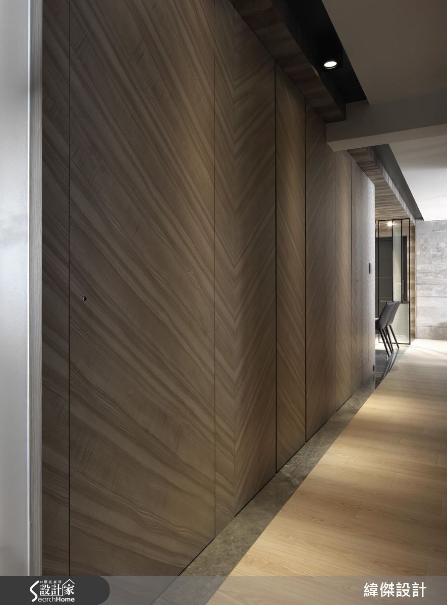 原为老屋的93平空间,有天花过低,以及采光、通风不良的问题。为了打造开阔、透亮的空间感,设计师利用视觉魔法,稍微降低玄关高度,