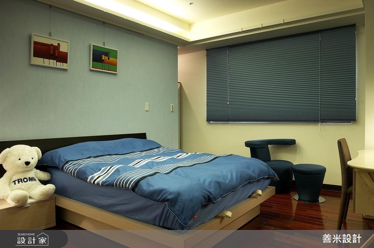 一家四口入住在开阔的5房3厅隔局里,设计师利用现代风格描绘室内,创造出干净、俐落的空间感受,客、餐厅之间藉由木作展示柜界定,营