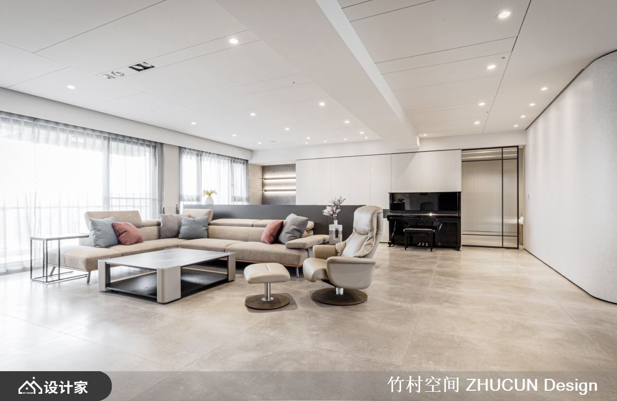 172 平米新成屋空间宽敞、採光极为充裕,设计师以黑、白、灰三种色彩元素,铺陈出简约风的时髦与舒适。公领域运用开放的格局安排,不