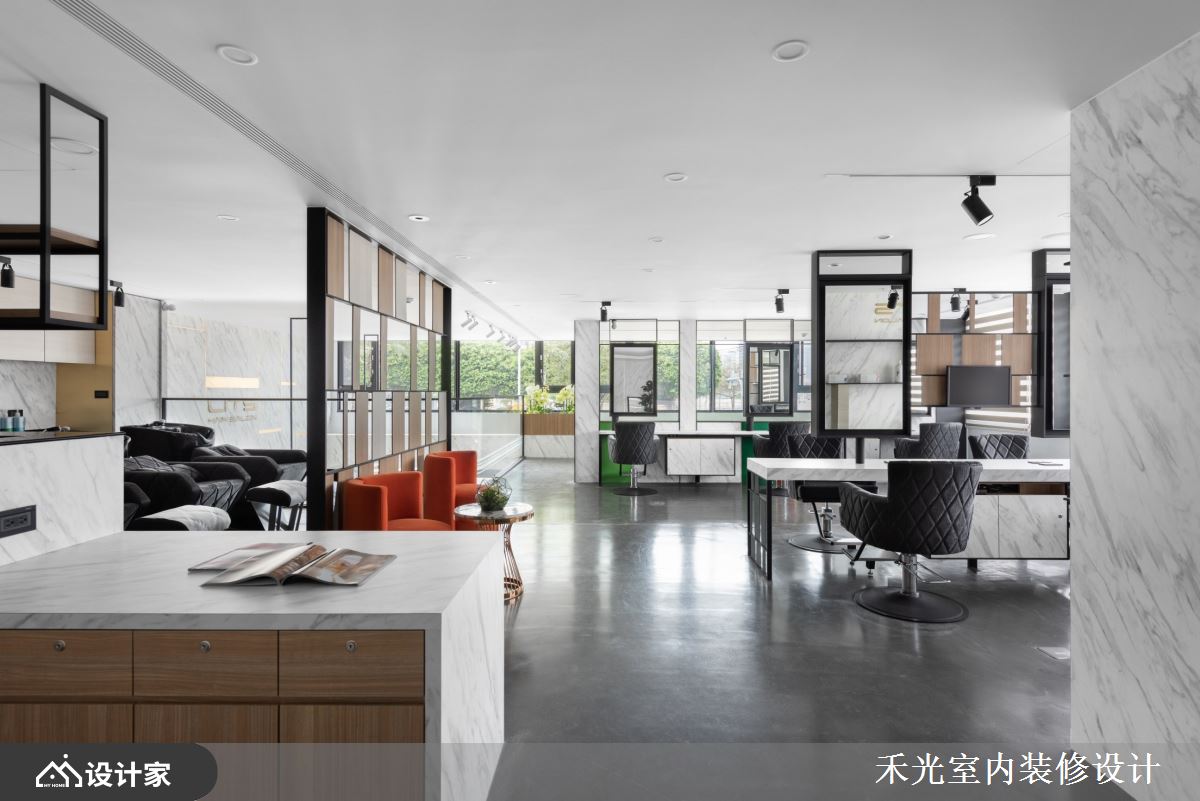 推开玻璃大门后明亮透白的视觉感受搭配着跃层挑高设计,有别于一般灯光昏黄、色调暗黑的商业空间,将神清气爽的空间氛围传递给上门的