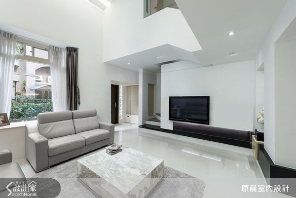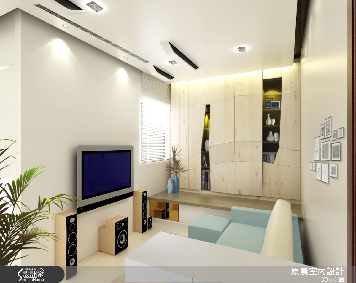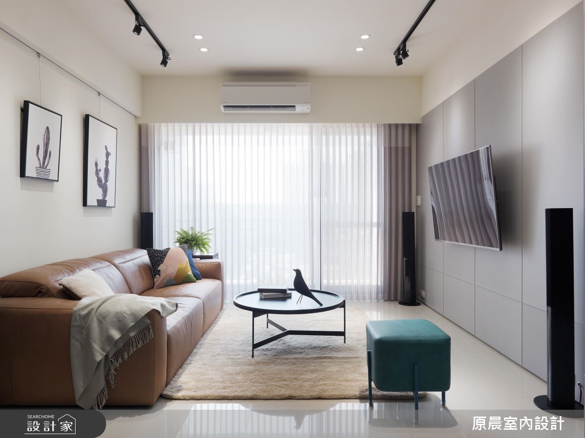 空間裡存有樑柱問題,設計師透過簡化的視覺設計,以簡約、清爽質感打底,大量的白色為基底下,入口處壁面飾以幾何深藍色調,讓客廳窗