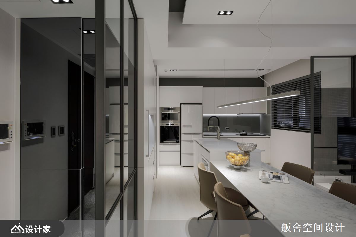 此案为15坪新成屋,舨舍空间设计 颜善松设计师解放原有的既定隔间,以穿透式玻璃作为场域分野,有效串联充沛采光并延伸空间视觉,同时