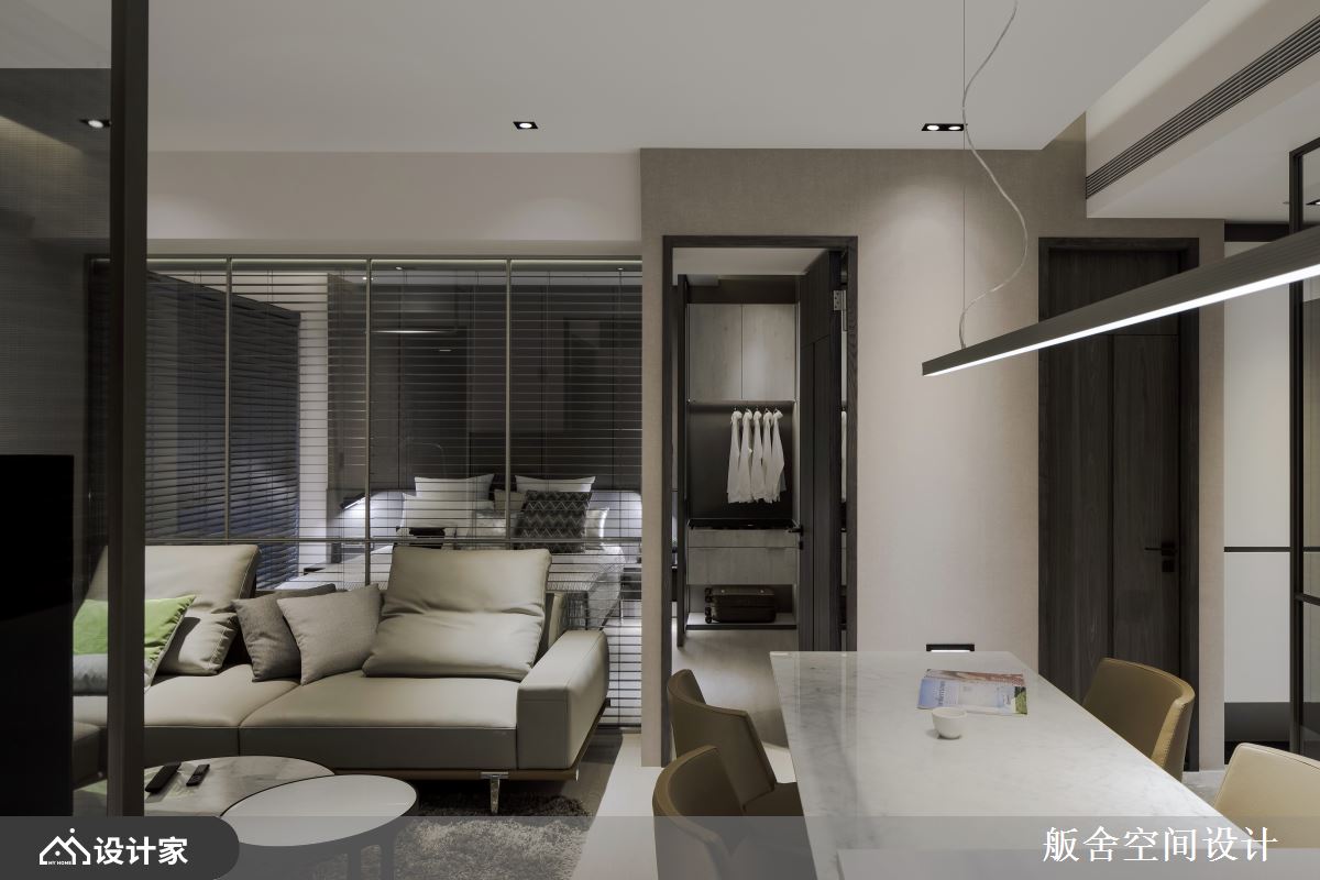 此案为15坪新成屋,舨舍空间设计 颜善松设计师解放原有的既定隔间,以穿透式玻璃作为场域分野,有效串联充沛采光并延伸空间视觉,同时