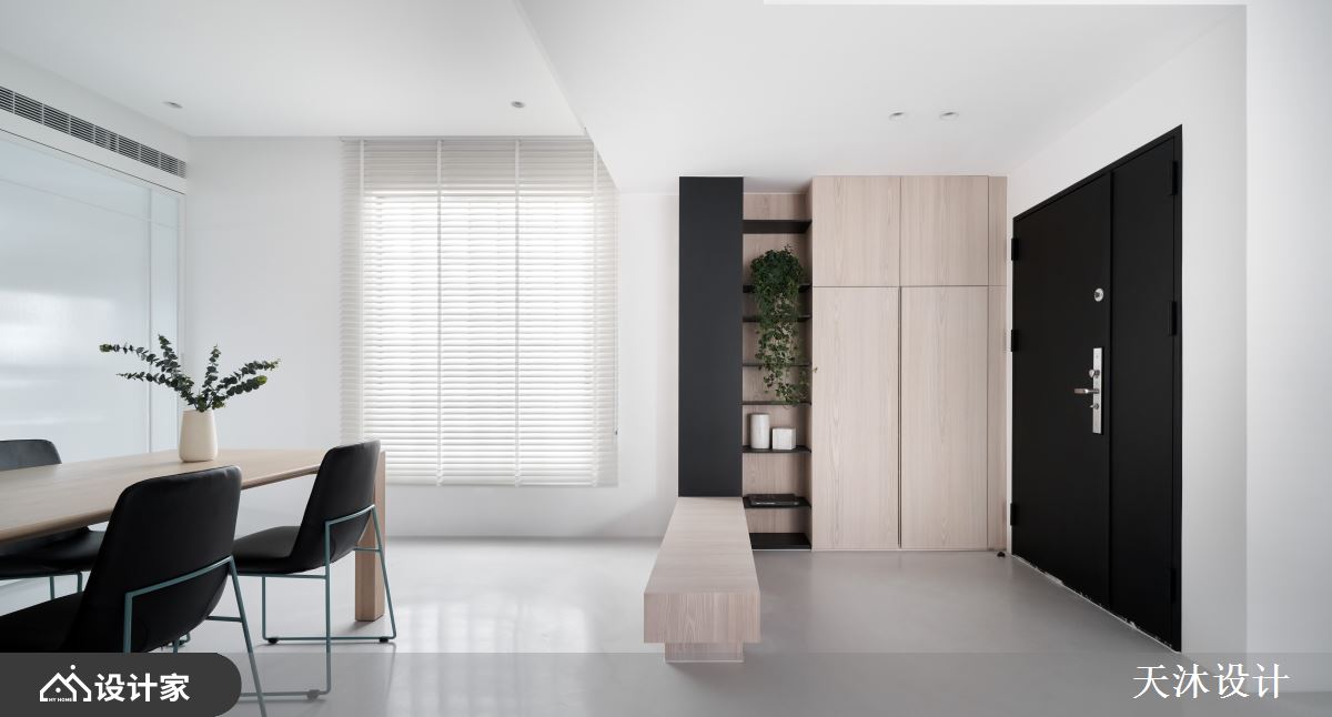 以形随机能的概念,玄关俐落几何造型柜体完美整合门片柜、展示架与穿鞋椅,浅木与雾黑的设计与地板和电视墙设计相呼应;内部老窗改为