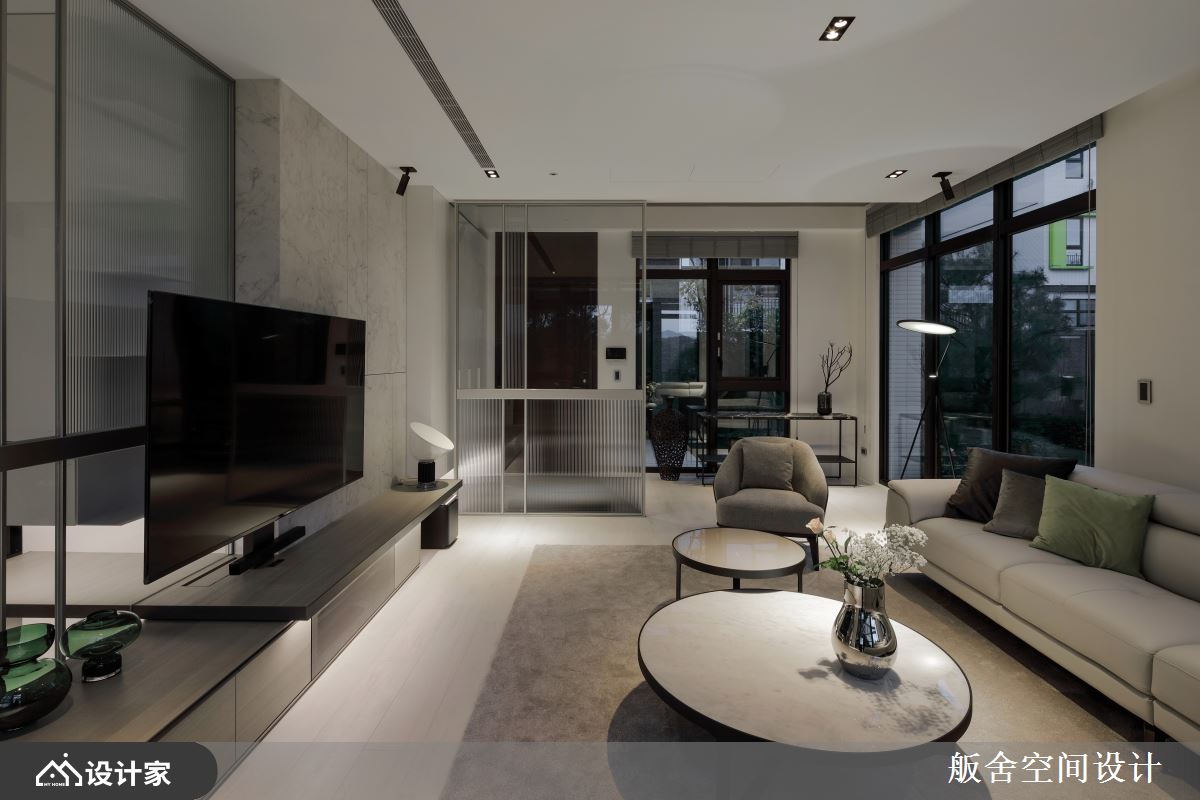 共三层楼的独栋别墅,原为毛胚房在格局规划上拥有灵活的自由度。一楼为公领域语庭院区,进门玄关处通过长虹玻璃和透明玻璃交错的组合