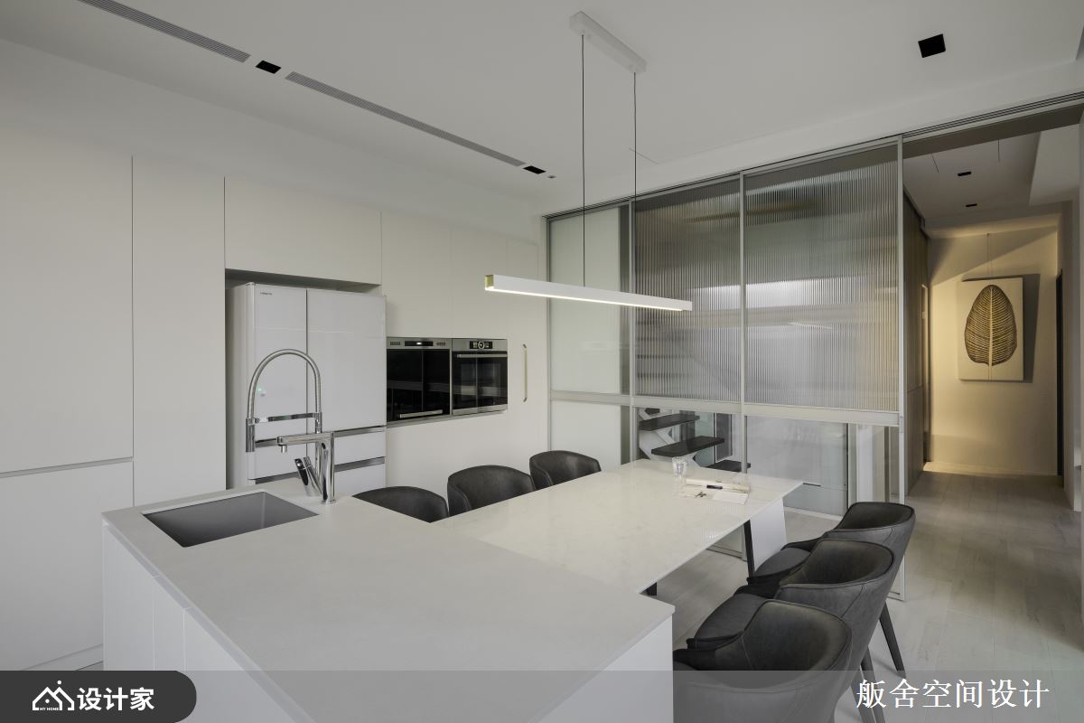 共三层楼的独栋别墅,原为毛胚房在格局规划上拥有灵活的自由度。一楼为公领域语庭院区,进门玄关处通过长虹玻璃和透明玻璃交错的组合