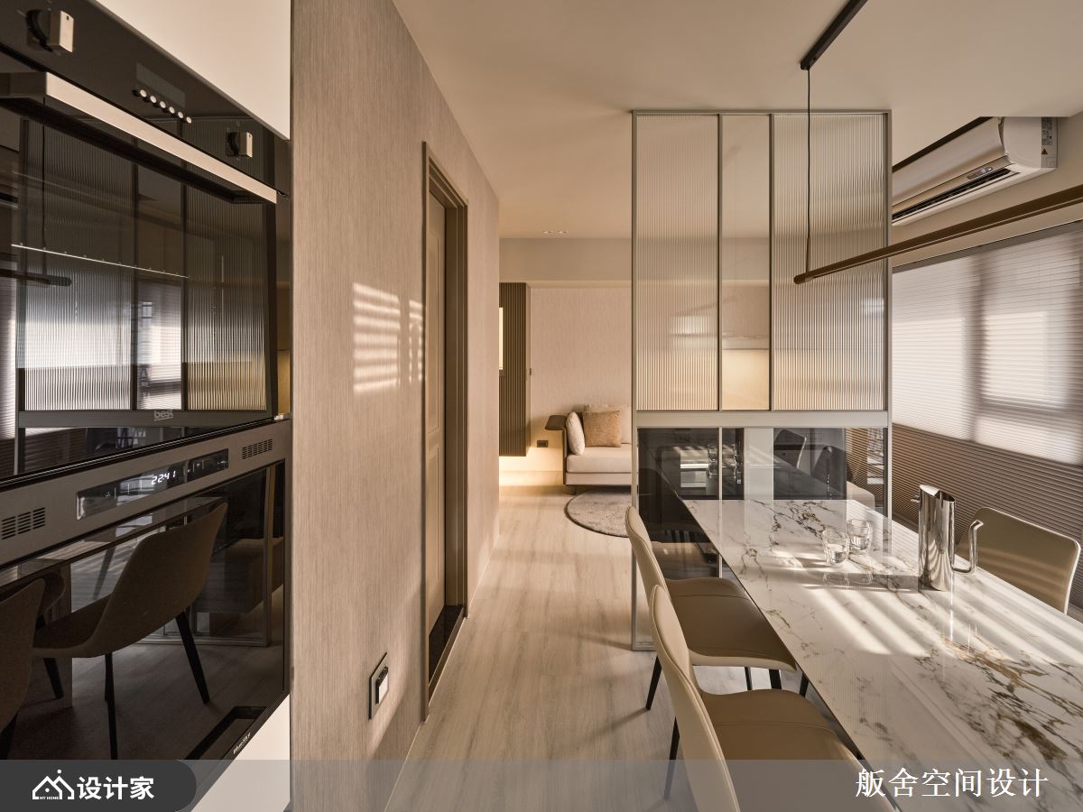 在有限的坪数创造出完善的生活格局,是现今设计师最大的挑战!舨舍空间设计活用玻璃屏风取代隔间墙,整合客厅与餐厨空间,让爱下厨的