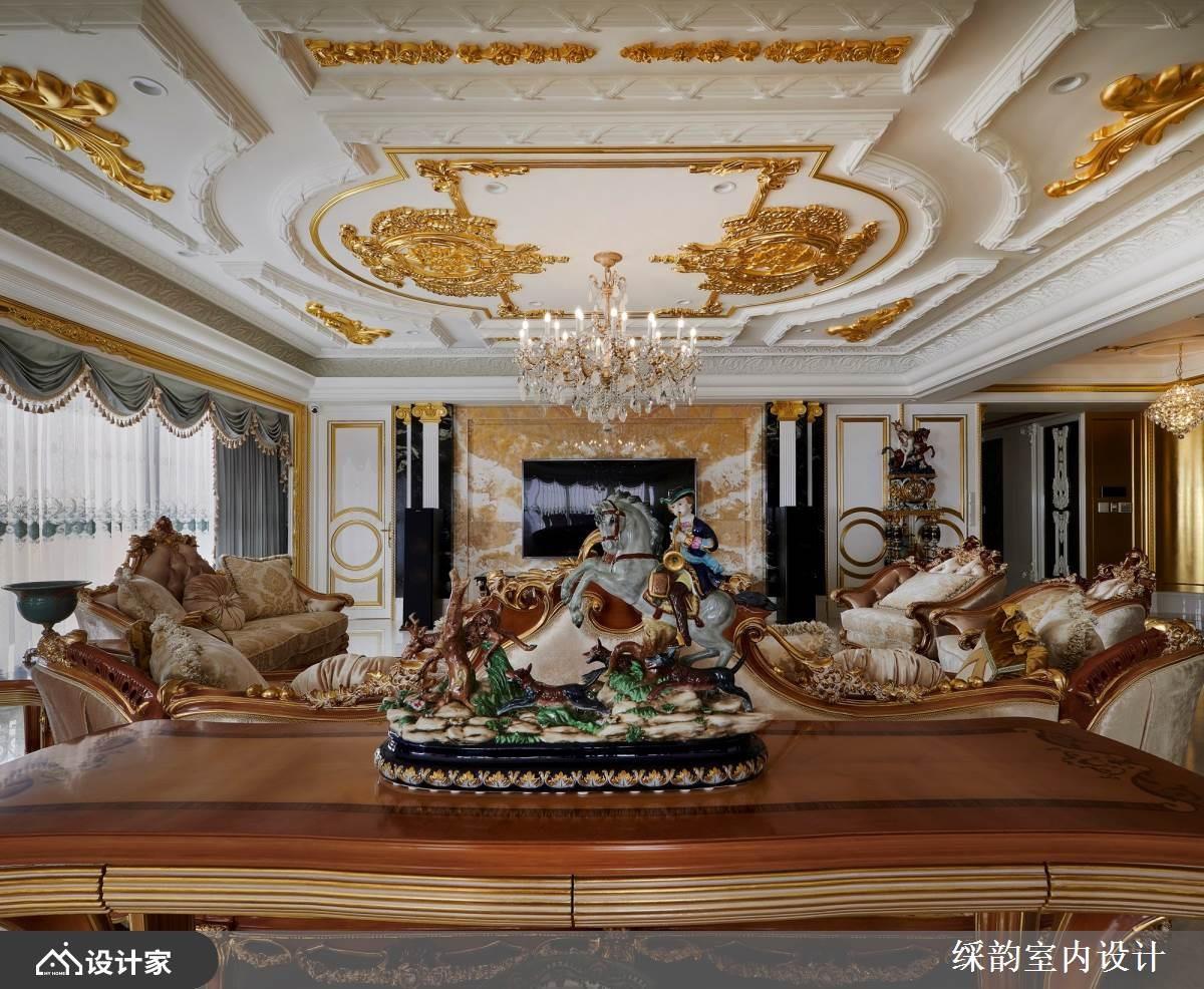 豪宅风格千变万化,但有一种经典设计历久不衰──欧式古典,此种 Luxury Classic 底蕴呈现欧式宫殿般的瑰丽气派,针对此案,䌽韵设计同时揉入洛可可风格的极致细腻与典雅风范,搭配精雕细琢的天花板雕刻与奢金点缀,使人联想到欧式教堂或皇宫