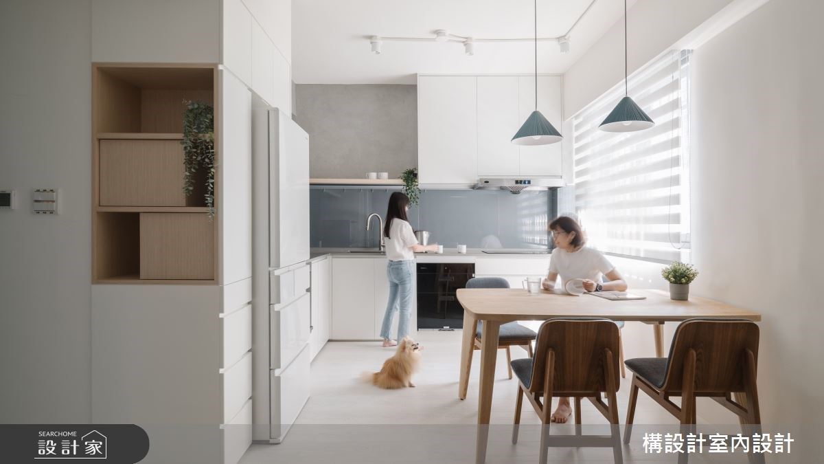 50 坪中古屋重整格局,拆除隔间後找回了坪数优势,腾出空间规划充足收纳和储藏室,原本恼人的住宅大梁成为客餐厅的暧昧分野,最後将原始隔间墙改为玻璃拉门,白百叶修饰了老屋铝窗,用浪漫的新古典语汇实践一家三口的梦想居所。