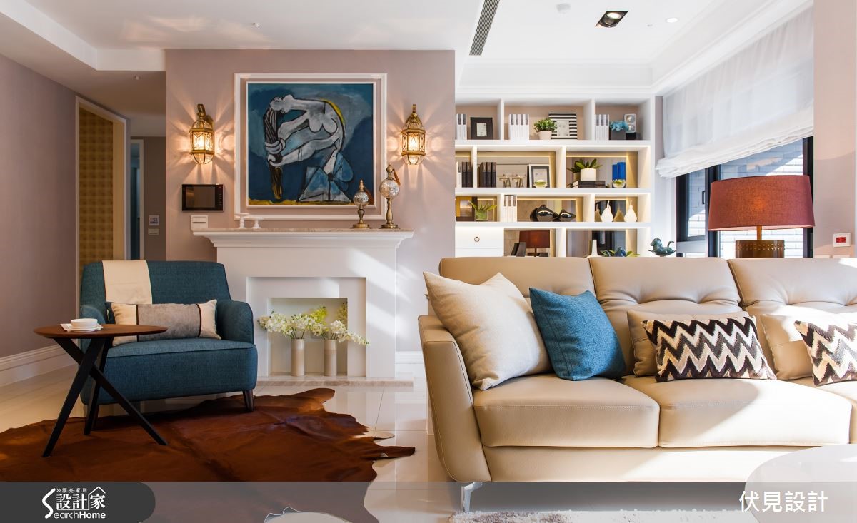 采用丰富色彩对比、图腾及精致灯饰,家具家饰的布置上则融汇东、西方经典元素,并融入舒适的生活质感。在设计师的巧手规划下,让这户新屋展现出强烈而鲜明的艺术生命力。【壁炉和画作上墙,丰富不单调】走入公共空间,以开放式设计将生活串连,采用经点的美式