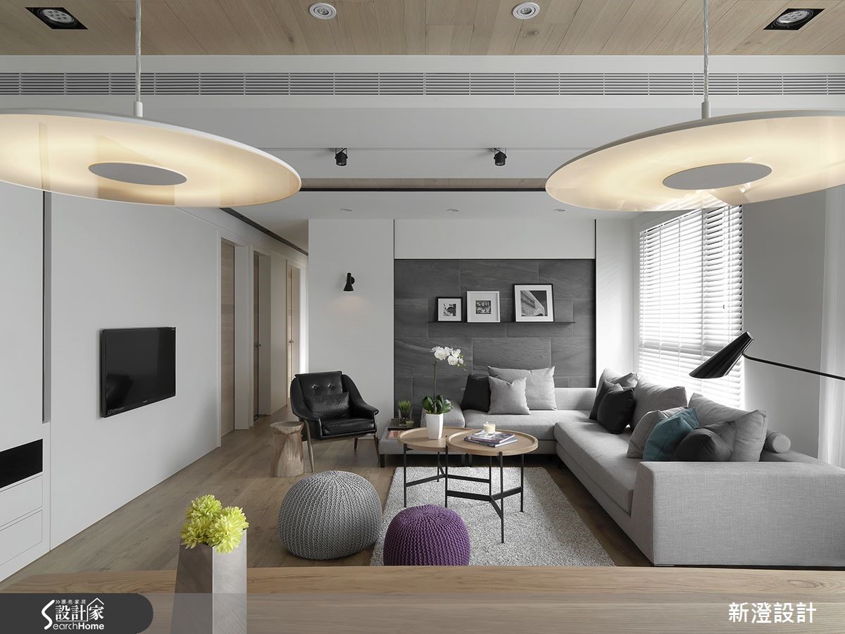 92平方米現代宅,格局2室2厅,设计师挹注随兴的现代风格,且让公私领域彼此分属,同时开放连贯,形成连串通透的生活场域,让两个人的生活更加亲密无间,有如身处城市中的小宇宙。【深浅色对比,渲染时尚质感】居家以深色木地板铺陈全室,在大面积白调之中