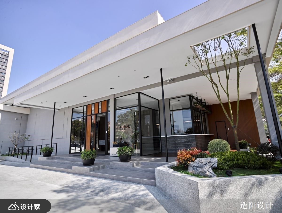 洁白的复式楼外观,树木穿越天井向蔚蓝的天际生长,顺着磨石子走入建筑本体,右侧铺陈木地板区是特别设计退缩外墙后打造出的对外咖啡吧台,玻璃隔间串连里外、自然地搭建起室内与户外的桥梁。以舒适生活为基石规划的大厅公设有绿树植栽以及自然建材,成为社区
