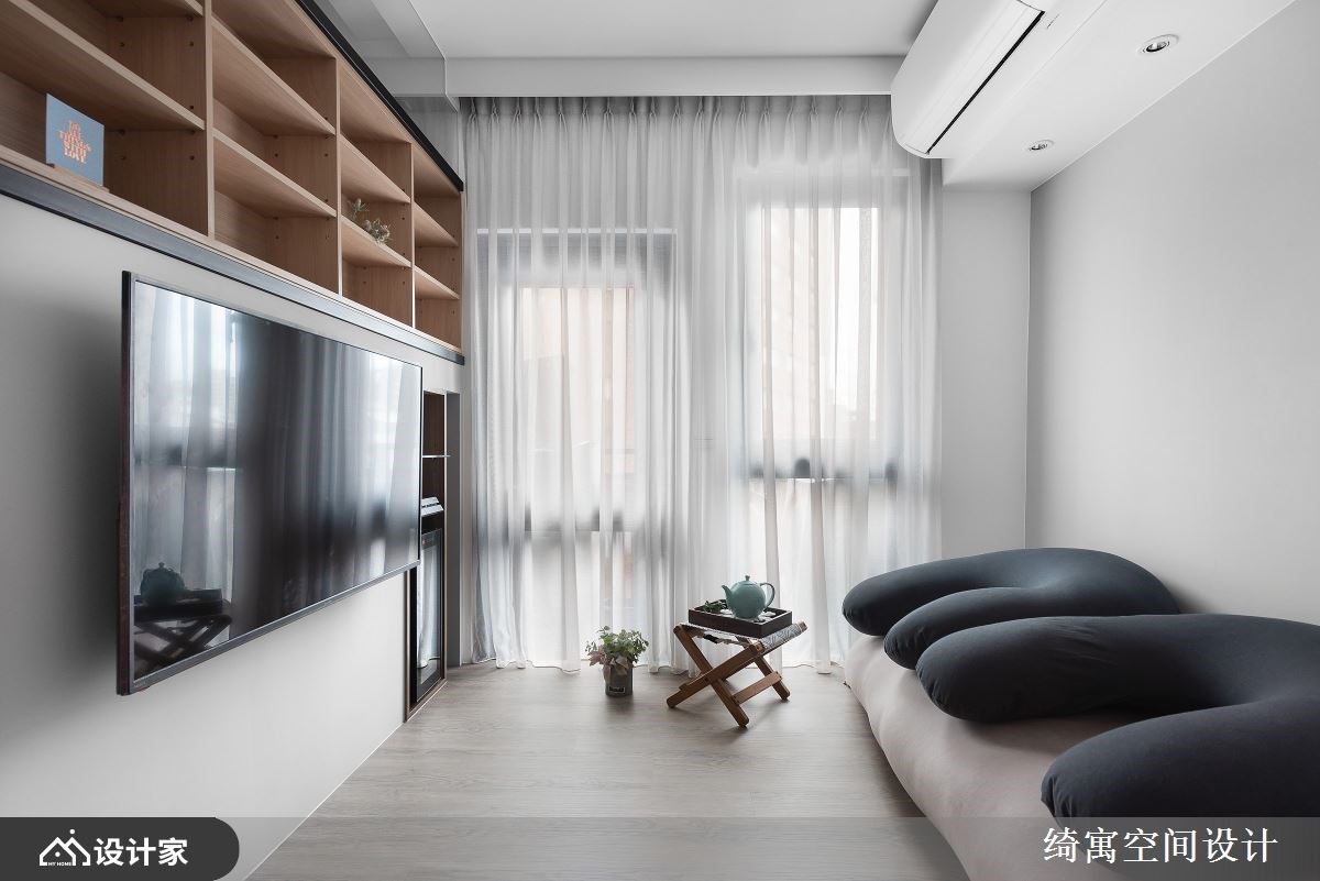 面对室内仅有 7 平方米大的迷你预售屋,绮寓空间设计重整建商原始的格局配置后小户型不仅拥有充足收纳,还放得两居室以及下整套厨房设备。首先,善用隔断厚度,在不影响动线与结构下替小户型争扩容收纳;半高电视墙上方以木工设计开放式收纳,电视墙右侧凹