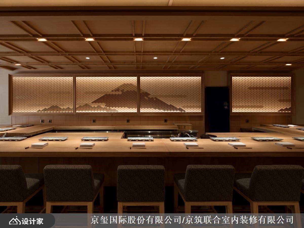 傍晚时分,天色渐渐暗了下来,台北街头这处 83 平米日式料亭入口,由「绵平织」暖红帘幕、「京都云龙面板」灯箱交织出温暖而低调的光氛,衬托着一旁木质门扇,迎来浓厚的传统和风料亭氛围,彷佛带着过路行人或前来享受美食的饕客,置身一回日本江户时代,