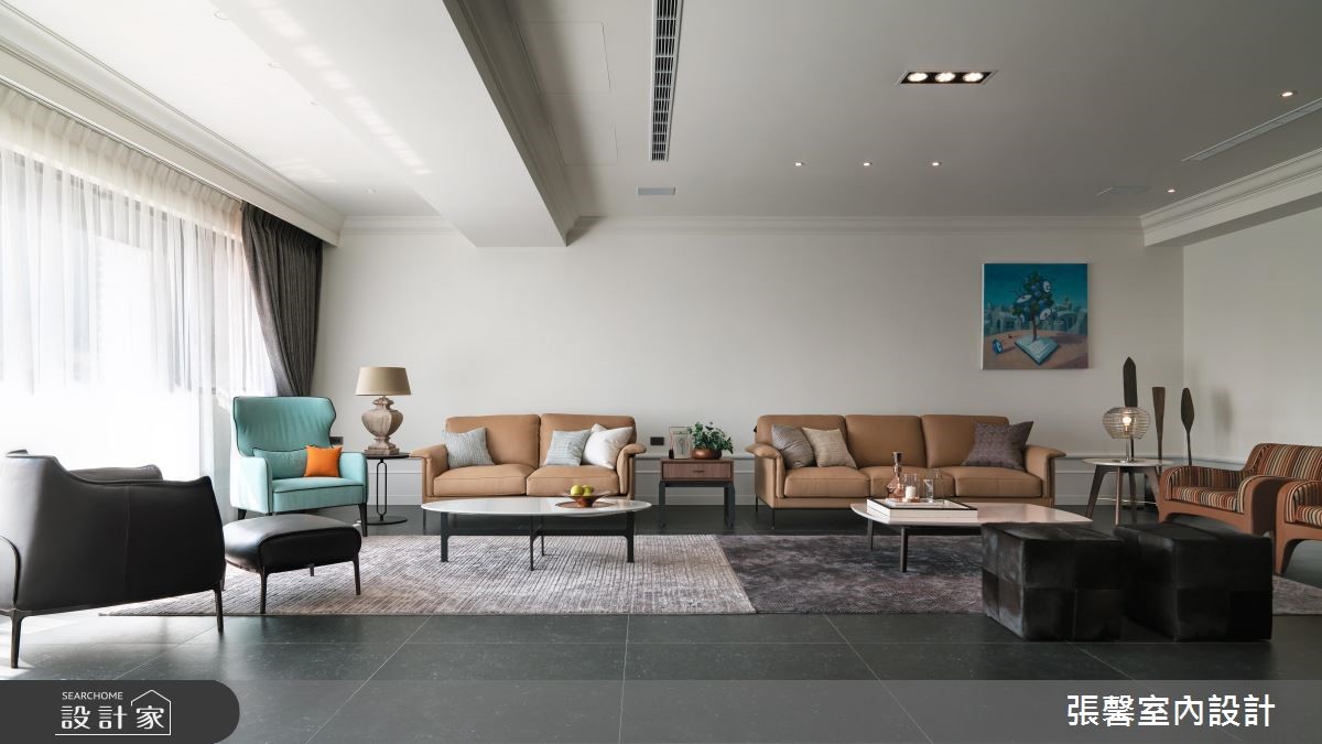 实品屋必须要顺应屋型、凸显建案的优势,本案座落于台湾南部地区 463平米的独栋楼,仝育设计团队以开放公领域及机能完备的私领域设计,打造相当适合三代同堂的规划。一楼以开放式设计串连客厅与餐厨空间,以「东方美学」为定调,沙发背墙与电视墙带着沉稳