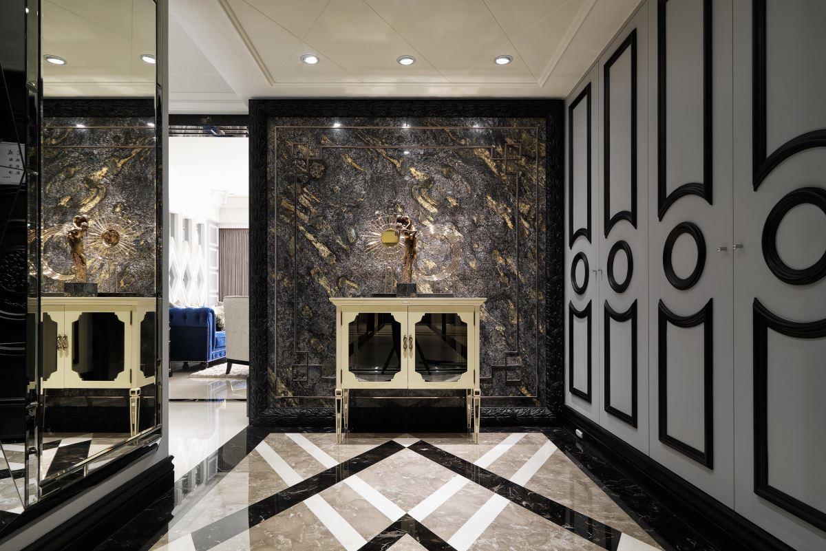 细腻线板、绮丽雕饰、华贵图腾,在莳筑设计总监朱皇莳的美学眼光与极致的工艺技巧中,烘托出独树一格的新古典风格。玄关,最能营造新古典大宅大器低奢的迎宾气势;而图腾雕饰型塑的端景画面,则最具有视觉惊艳的精工之美;而对称呼应的精品柜体或格局配置,更
