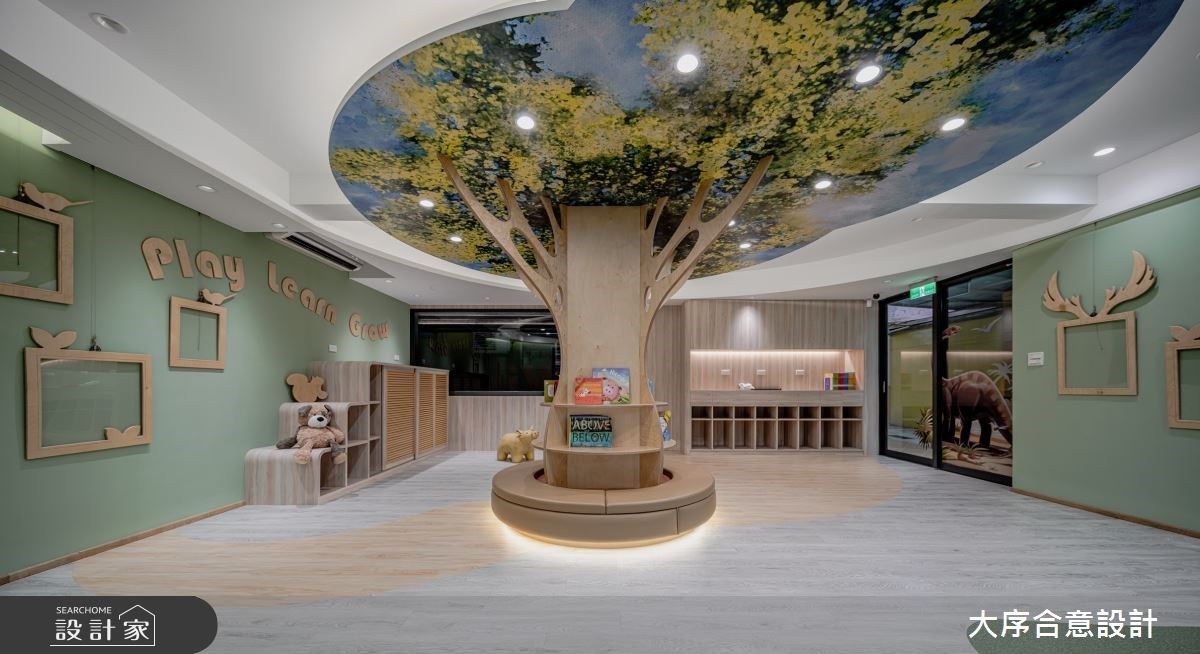 以教育為取向的35坪商業空間,為了給孩子友善自在的成長環境,將「樹木」作為設計靈感,選擇清新綠色調與木作質材,...