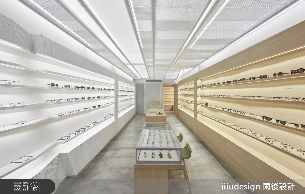 20坪老屋翻新成摩登現代的眼鏡店,延伸鏡片本身凹透鏡特性,所呈現的視覺曲線等影像效果,傳遞至天花與櫃體設計,商...