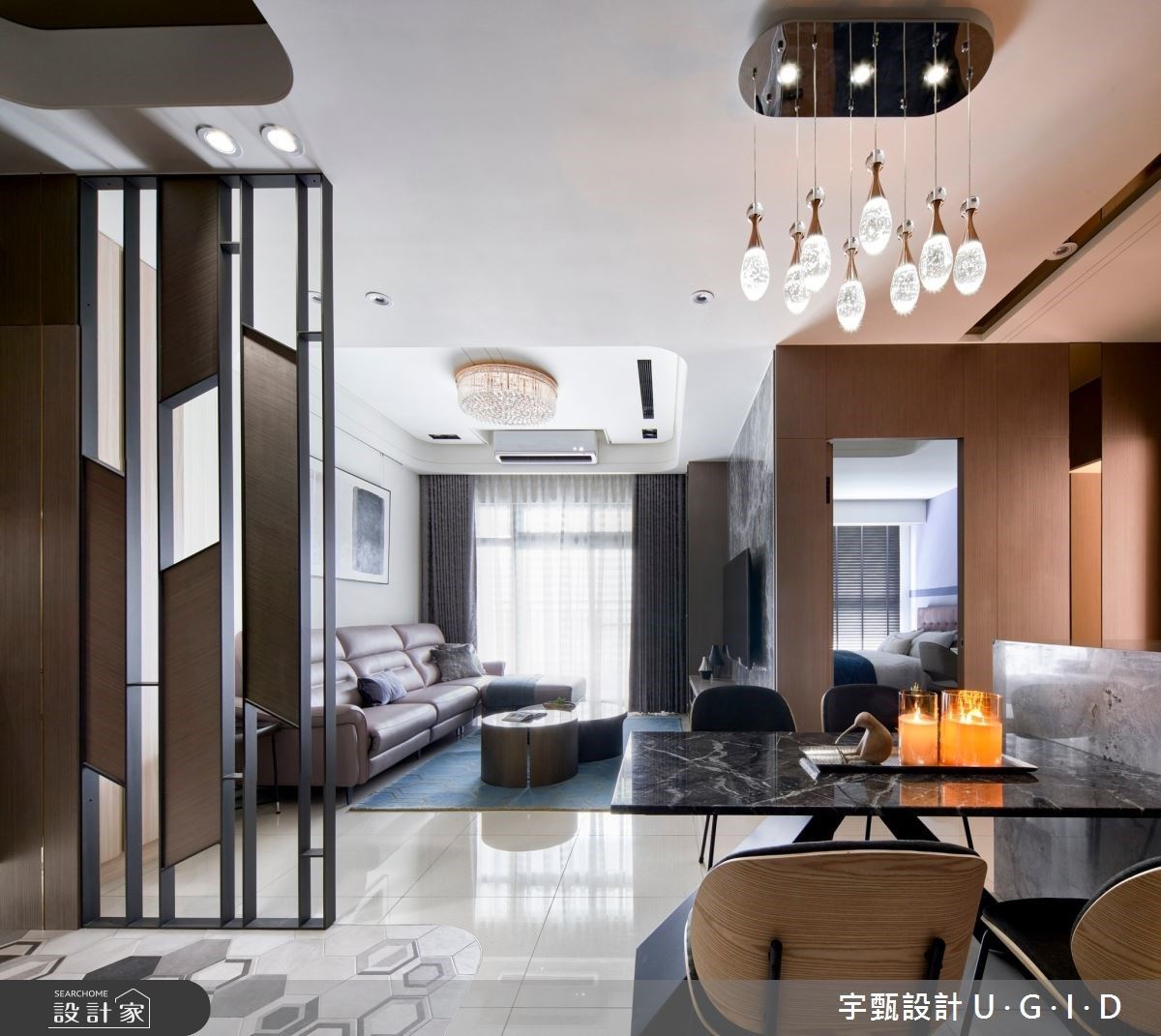 36坪現代風空間裡,入住一家四口,以屋主喜愛的飯店風為設計方向,掌握石材比例、搭佐水晶吊燈與異材質銜接,刻劃細...