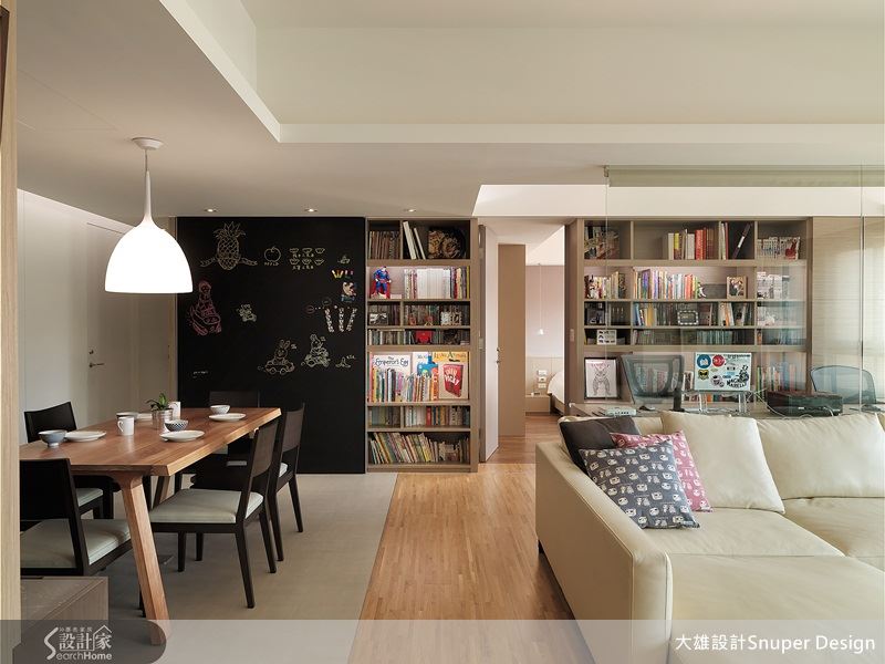 本案的格局基礎為三房兩廳的空間,設計師在公共區域後方打造了開放式書房,並且以整面書牆作為空間背景,創造出公共區...