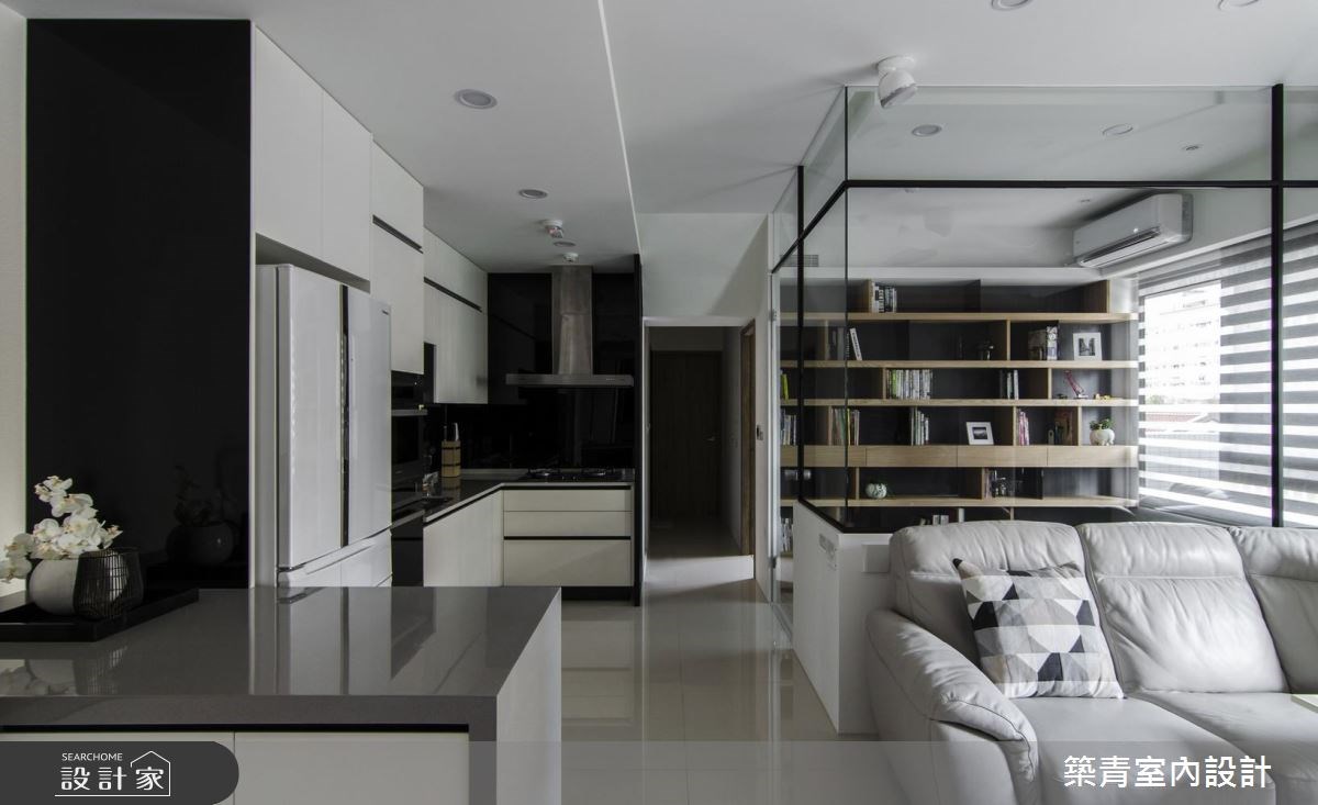 40 坪的現代風居家,設計師在客變時,即將客廳後方的房間牆面予以拆解,改為半牆並結合清玻,做為客房與書房兩用空...