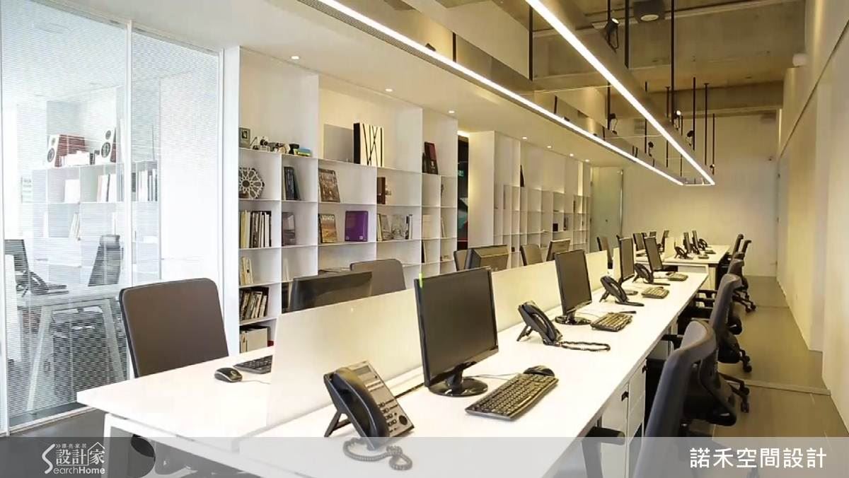 整間辦公室,從進門到底,分成三個區塊,會發現空間以彩、白、黑的層次,創造空間流動,材料室以深色,一方面能讓材料...