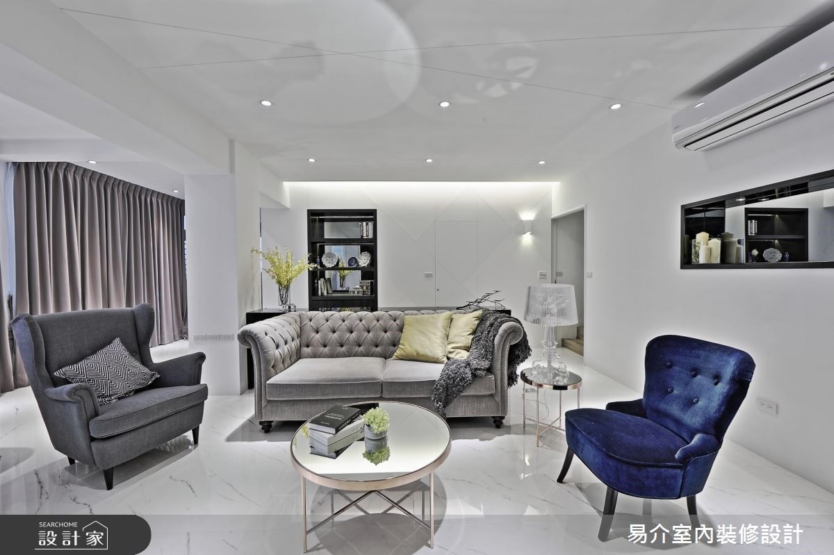 60坪中古屋翻新白色新古典宅,先將基礎工程重新整頓,延攬大面採光入室,營造明亮、潔淨的空間質感;規劃開放公領域...