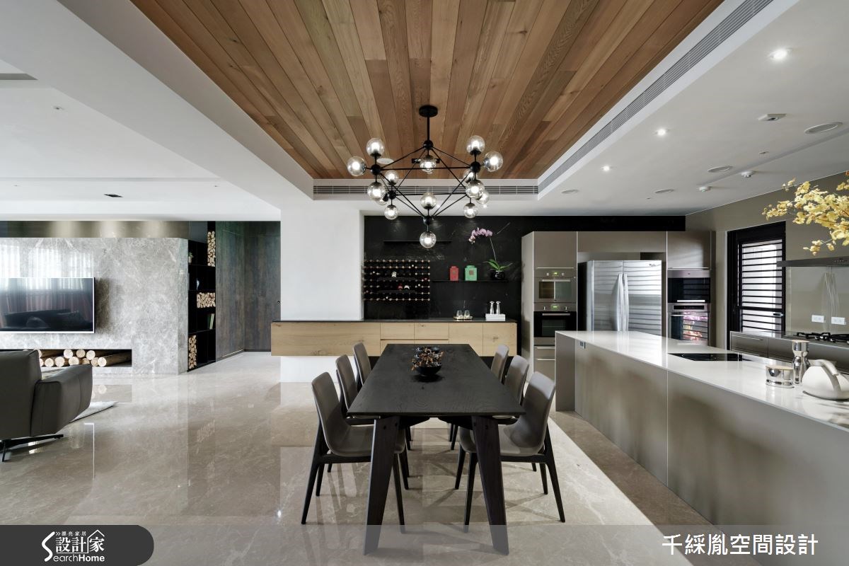 40 坪居宅,設計師大膽將電視主牆與餐桌加以結合,使餐廳成為空間主景,客廳則退居次要,並加入胡桃木皮作為主題色...