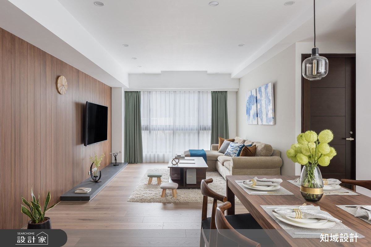 35 坪現代風單身宅,設計師運用一木質電視牆,帶出整體設計理念,巧妙將公領域視覺延展放大。並運用清爽色系軟件搭...