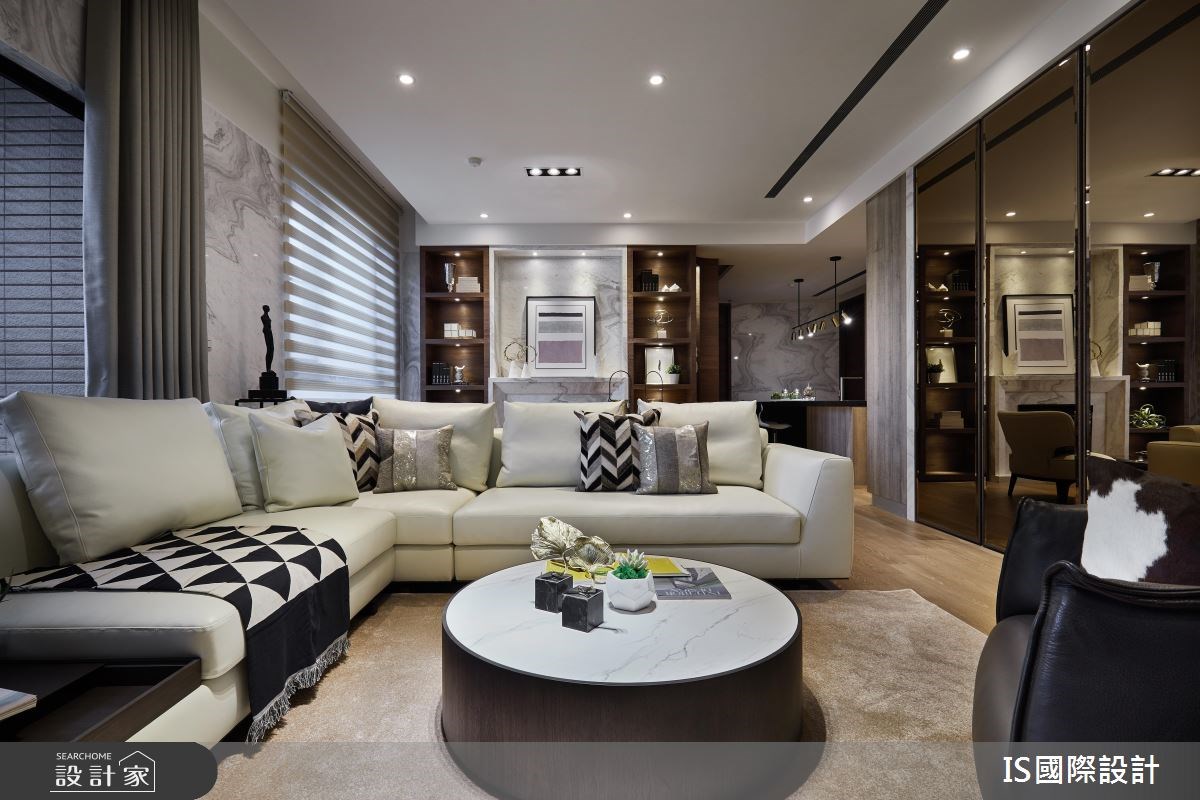 36.2坪現代風居家,設計師規劃雙客廳格局,打造出溫馨的相聚場域,並賦予鏡面及石材,搭配不受拘泥的軟件陳設方式...