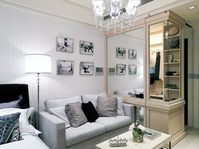 7.6坪的套房,僅衛浴有空間區隔,如何在開放的空間中,界定廚房、客廳、臥房、書房的領域,甚至還要設置更衣間,的...