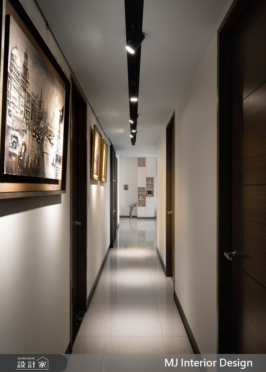 銘家MJ Interior Design以乳膠漆、壁紙、石英磚/拋光石英磚、鍍鈦金屬、木作貼皮、大理石、繃布、噴漆、茶鏡、長虹玻璃的搭配應用,呈現輕奢風居家氛圍,將此間22坪、三房、單層、新成屋(5年以下)打造成舒適愜意的家庭空間,完成全家人的夢想之居。