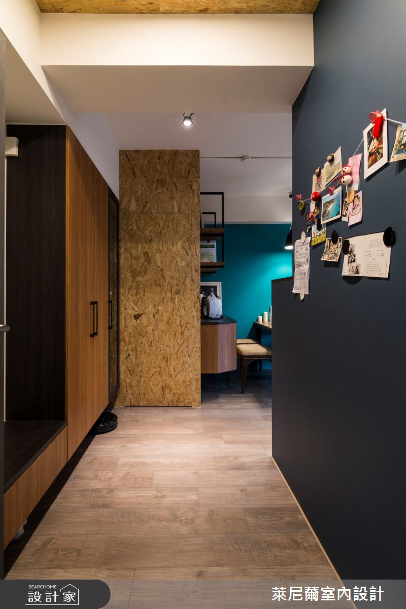 26 坪中古屋,設計師以 Loft 風為基底整頓屋況,將水電線路管路予以更新,並透過格局變動,把客房改為玻璃隔間、廚房變為開放式格局,讓客餐廳串聯放大、強化採光條件,同時也替屋主打造專屬更衣間,滿足屋主一家的生活所需,快跟著小編一起來看看吧! 玄關區域,因考量活用品,在入口處做了小儲藏室,挹注實用機能;並將客房及廚房改為開放式格局,緩解原先空間壓迫的窘境,首先將客房改為活動玻璃隔間,增加居家通透感,此外也在廚房配置吧檯、改為開放格局,讓廚房和客廳保有互動連結;電視主牆則採用磚紅色文化石鋪陳,締造視覺主題亮點,搭配柚木色櫥櫃與家具,形塑場域的沉穩氛圍,而餐廳牆和廊道牆面部份,則跳脫配色揮灑亮眼的湖水綠,替深色系背景帶入高明度色彩,創造整體的豐富層次性! 小編的最愛 居家入口處,在玄關牆面規劃了磁性黑板漆牆,一方面可作為家人的互動留言板,同時也讓孩子坐擁塗鴉繪畫空間,一舉兩得!