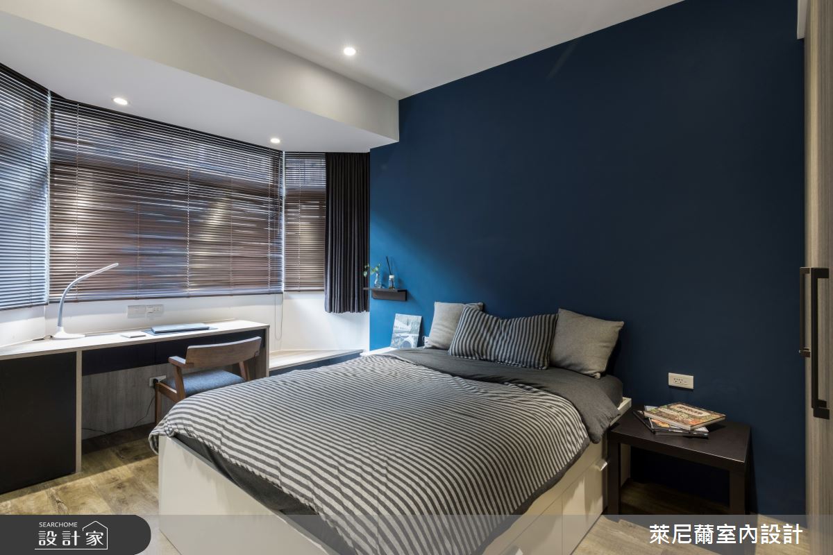 35坪中古別墅,實踐現代風的簡約精神,將老舊管線予以更新,並透過格局重整,藉由拆除廚房隔間,讓原有的採光優勢盡情發揮,並採以開放式設計,打造寬敞通透的空間視野,將窗外綠意引入,勾勒舒適愜意的混搭風家居。 公領域以電視主牆作為中心,一來區分客、餐廚區的界線,二來複合書桌機能,打造零距離的互動空間,凝聚家庭成員的情感。將清水模作為視覺焦點,使電視主牆與沙發牆相互呼應,搭配旁側的實木櫃體,運用簡潔俐落的手法,勾勒一抹溫潤質樸的自然氛圍。走入餐廚區域,為避免開門見冰箱的風水疑慮,特地將冰箱隱藏至實木櫃體間,重新整頓小家電配置,讓一字型廚房的動線更加順暢便利,滿足不同情境下的需求。 小編的最愛 有別於公領域的輕淺色系,私領域注入大篇幅的海軍藍與橄欖綠,並維繫簡約俐落的空間配置,在理性沉穩的居家環境中增添一絲趣味。