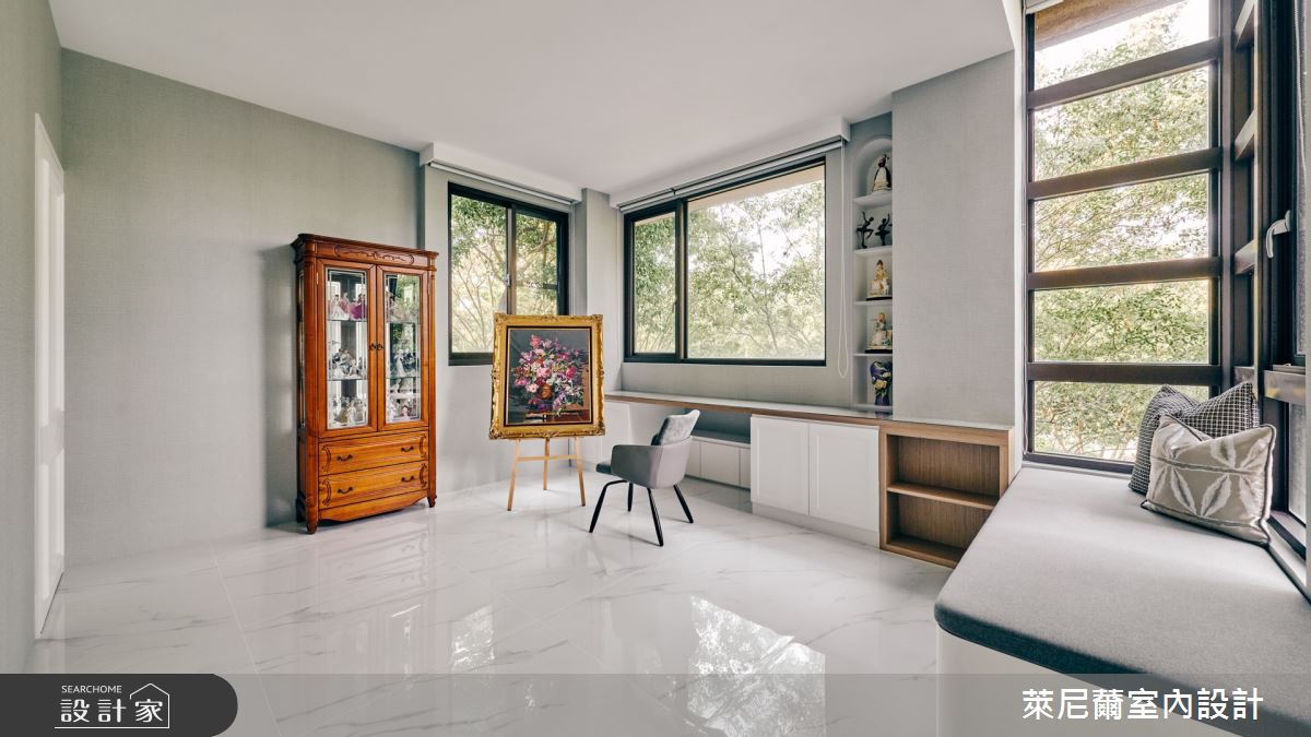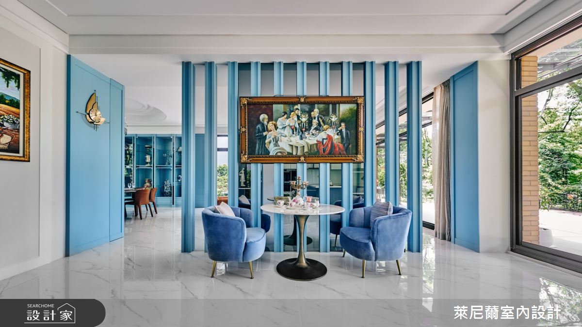 27坪單層宅邸,以輕盈雅緻的新古典風為基底,注入水藍色與純白色系,在美式線版的勾勒下,將屋主畫作轉化為空間亮點,拉近人與空間的距離,傳遞對藝術品味的堅持,形塑優雅而詩意的美學質感。 於玄關處,規劃假牆界定轉折,並結合百葉窗型的隱藏式鞋櫃,巧妙化解開門見窗的穿堂煞疑慮;公領域內,以方正的幾何線版,勾勒對稱的沙發背牆與餐牆,加入畫作與蒐藏品,創造富含人文韻味的展示區域;天花板運用圓弧燈盤、水晶吊燈,點亮空間的奢華氣息,增添高雅大方的視覺感受。走入餐廚區域,以白色木作拉門隔絕油煙氣味,運用簡練手法鋪排電器櫃,並將碗盤視為精品般擺置於展示櫃內,描繪出高雅和諧的家居端景。 小編的最愛 主臥以亮眼大方的鵝黃色鋪陳壁面,在窗般灑落的日光下,打造明亮通透感,並藉由鋼琴與畫作展現個人品味,讓新古典的浪漫情調瀰漫於室。