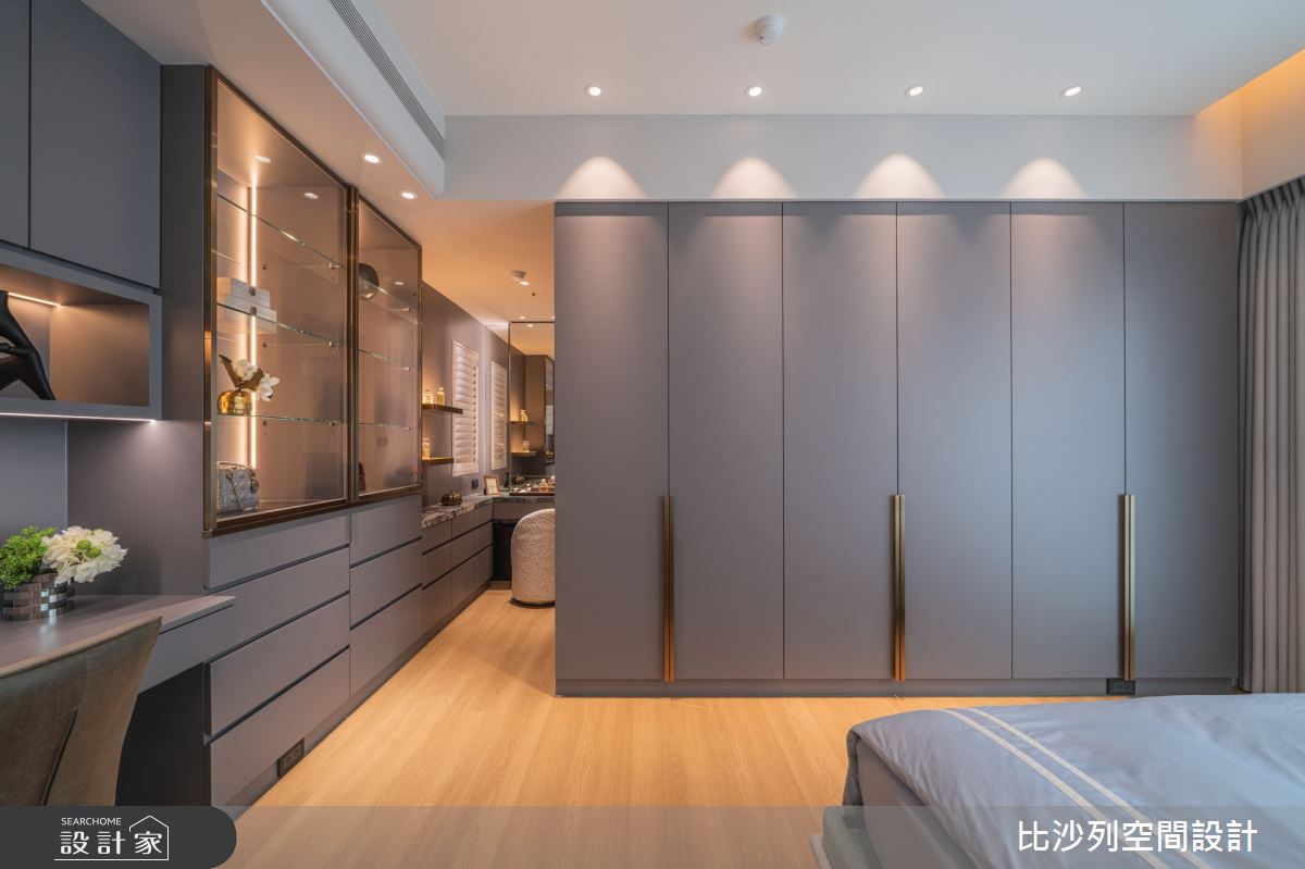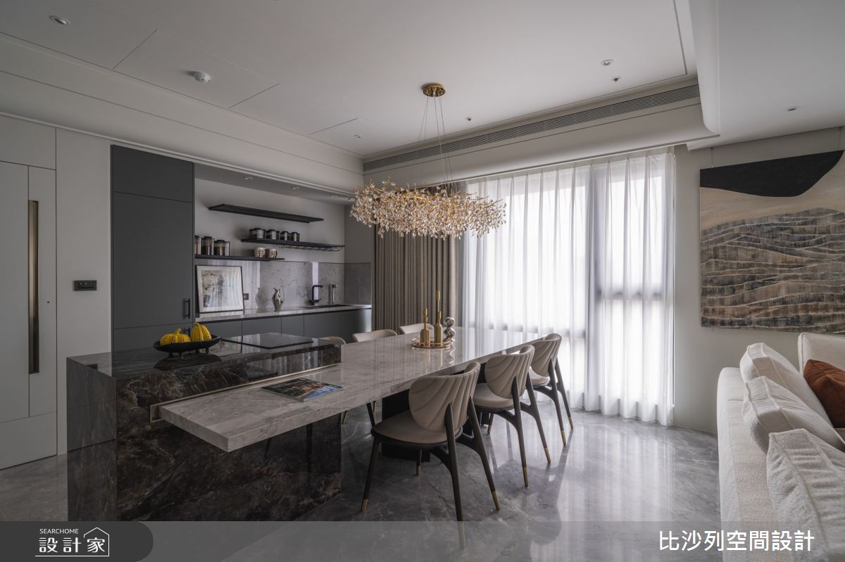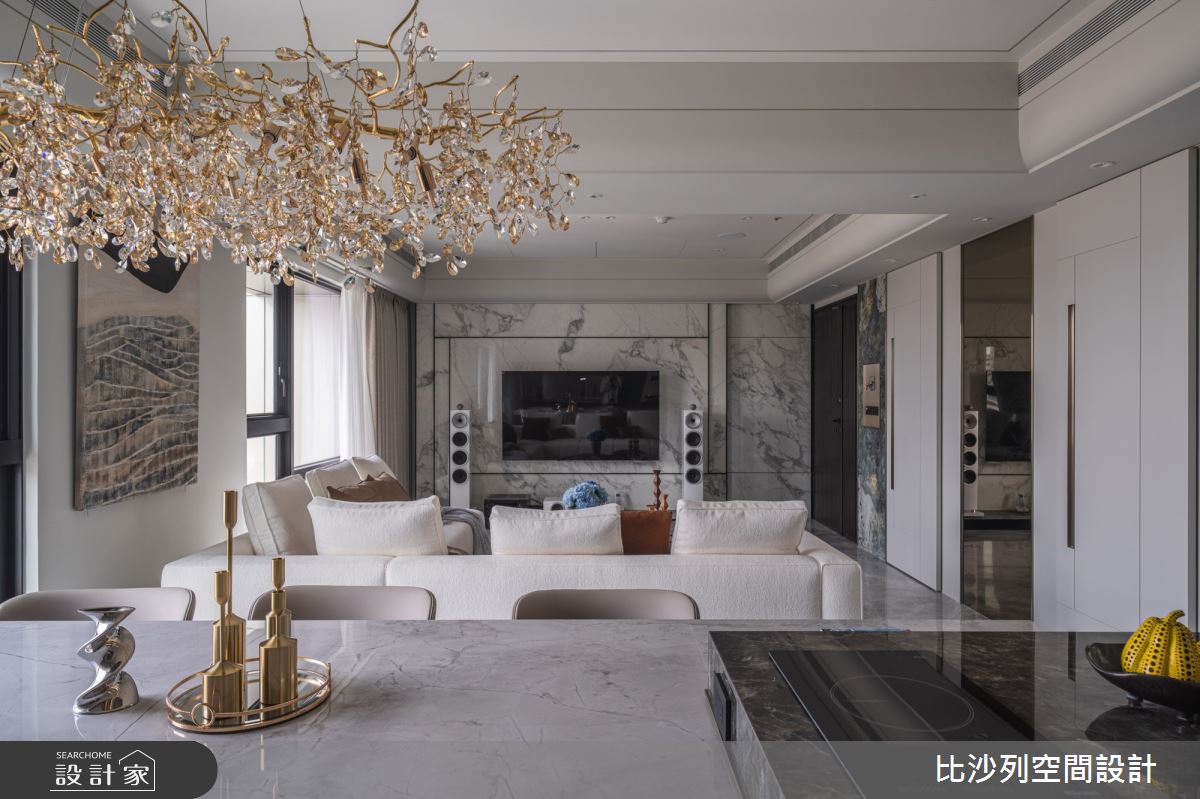 來自比沙列空間設計的45坪現代奢華風住宅案,是一間單層毛胚屋的三房格局,設計師藉由建材以石材、玻璃、鐵件、義大利麂皮漆、茶鏡、鍍鈦的搭配應用,實現一家人的理想生活。