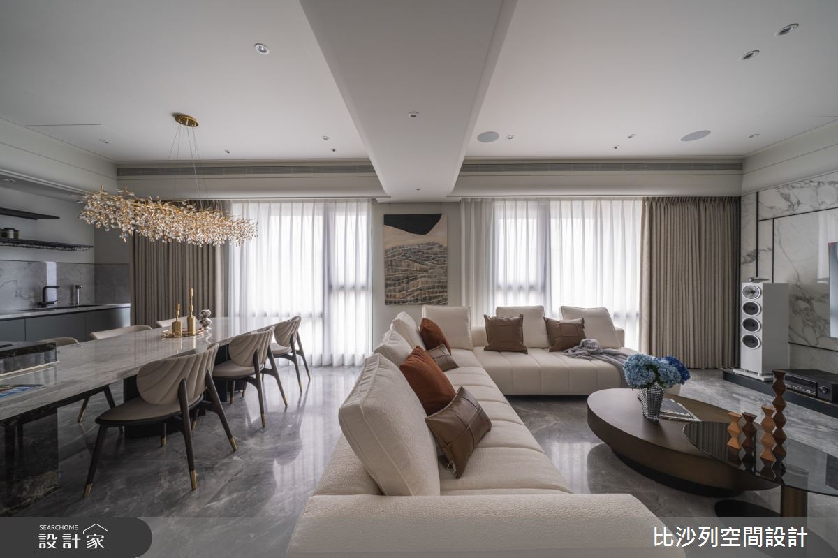 本案為比沙列空間設計的60坪現代風新成屋(5年以下)設計作品,格局為單層三房的居住空間。全室建材的搭配,應用大理石、鍍鈦金屬、玻璃冰磚、茶鏡、磁磚,展現溫馨的居家氛圍。