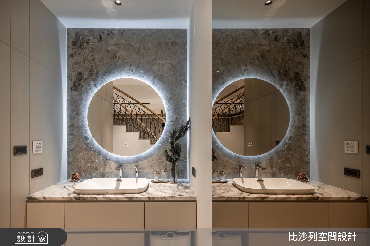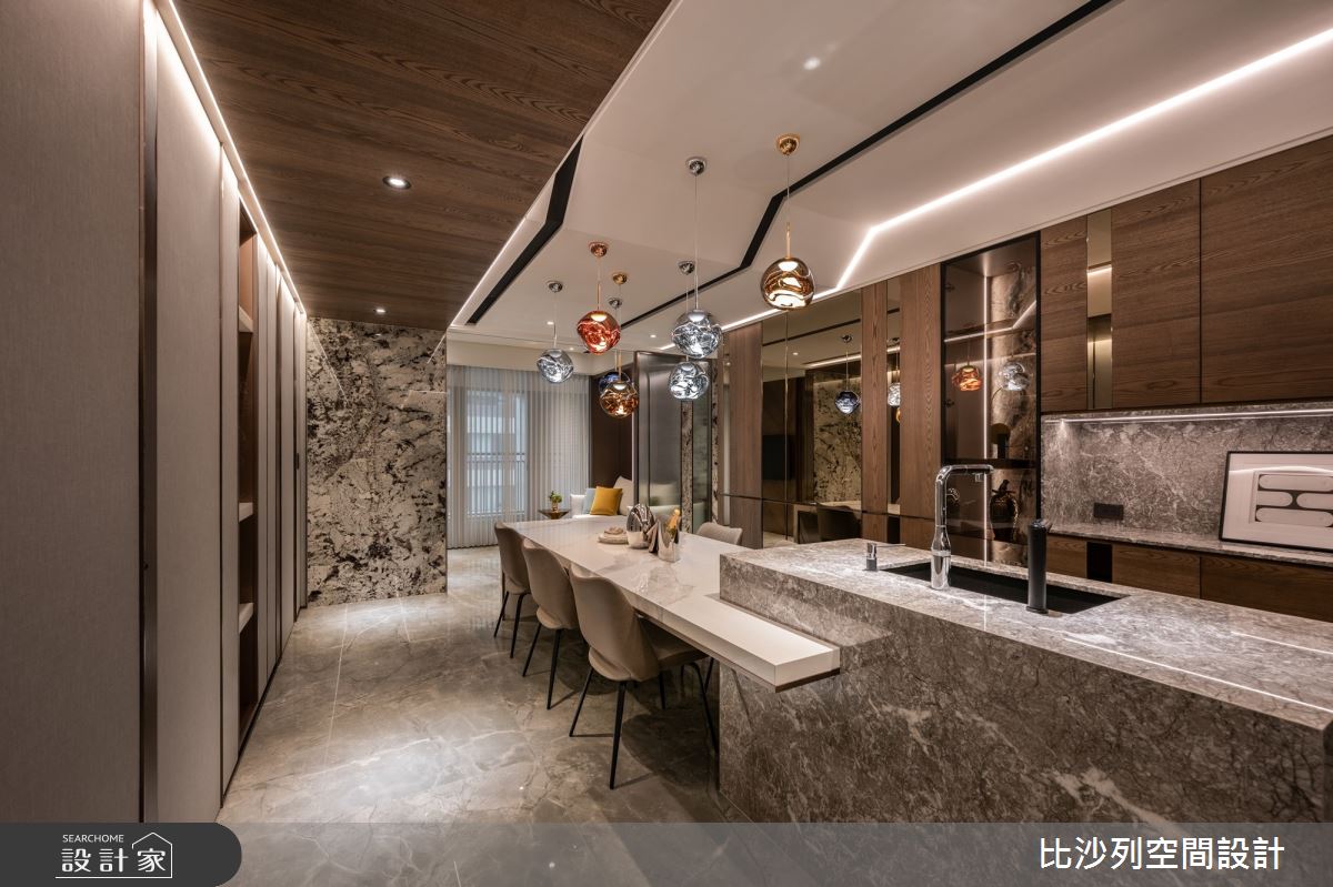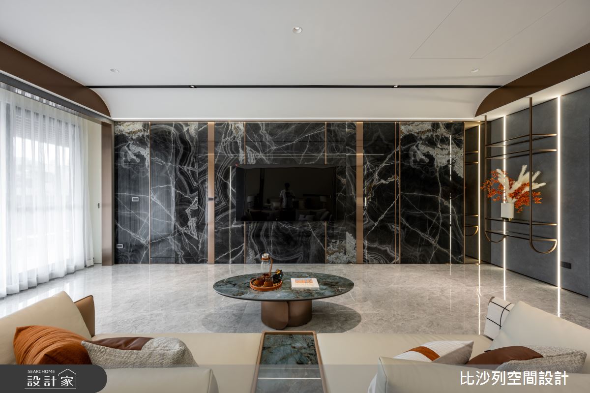 比沙列空間設計以茶玻、鍍鈦金屬、木作貼皮、大理石的搭配應用,呈現現代風居家氛圍,將此間108坪、五房、透天別墅、中古屋(5~15年)打造成舒適愜意的家庭空間,完成2位大人、2位小孩全家人的夢想之居。