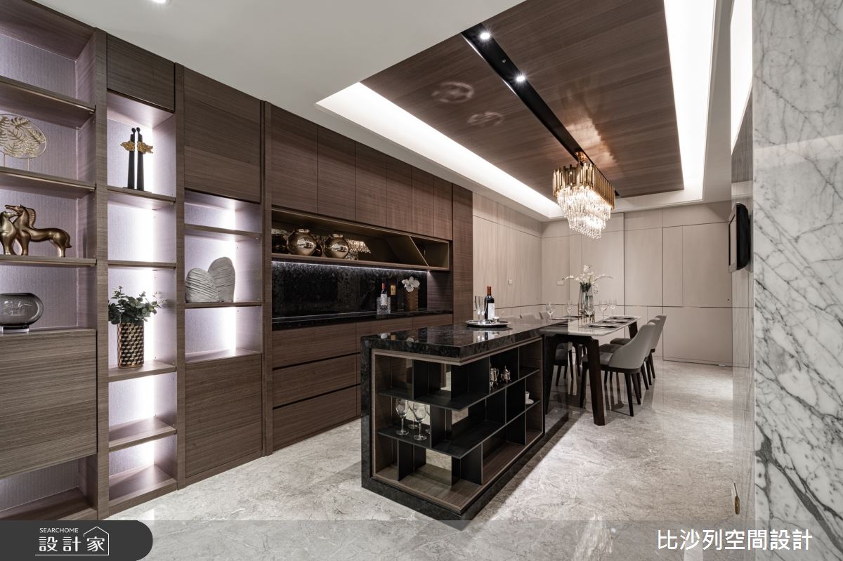 來自比沙列空間設計的34坪奢華風住宅案,是一間單層新成屋(5年以下)的四房格局,設計師藉由建材以木作(木皮)、鐵件、鍍鈦、噴漆、大理石、茶鏡的搭配應用,實現一家人的理想生活。