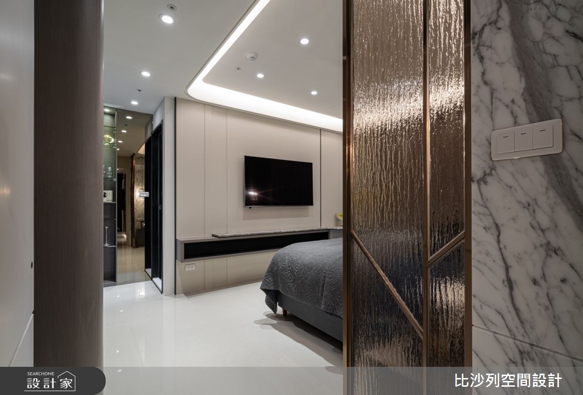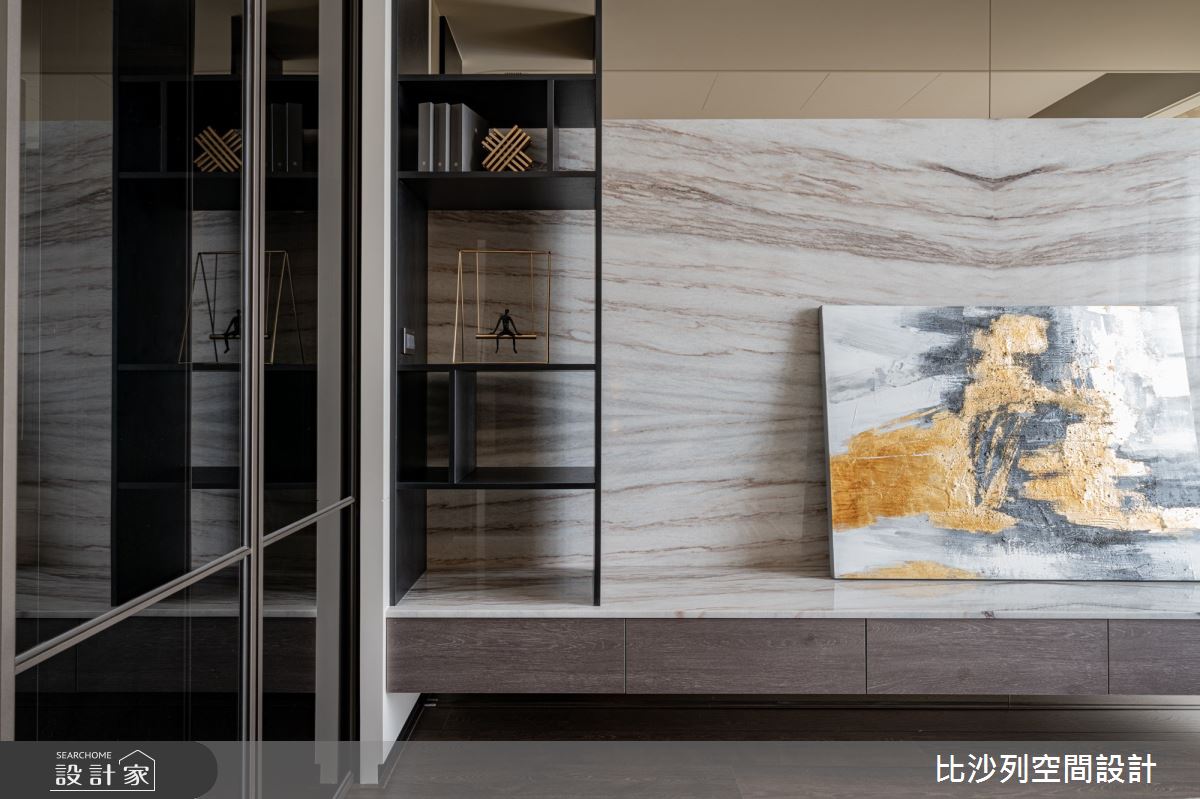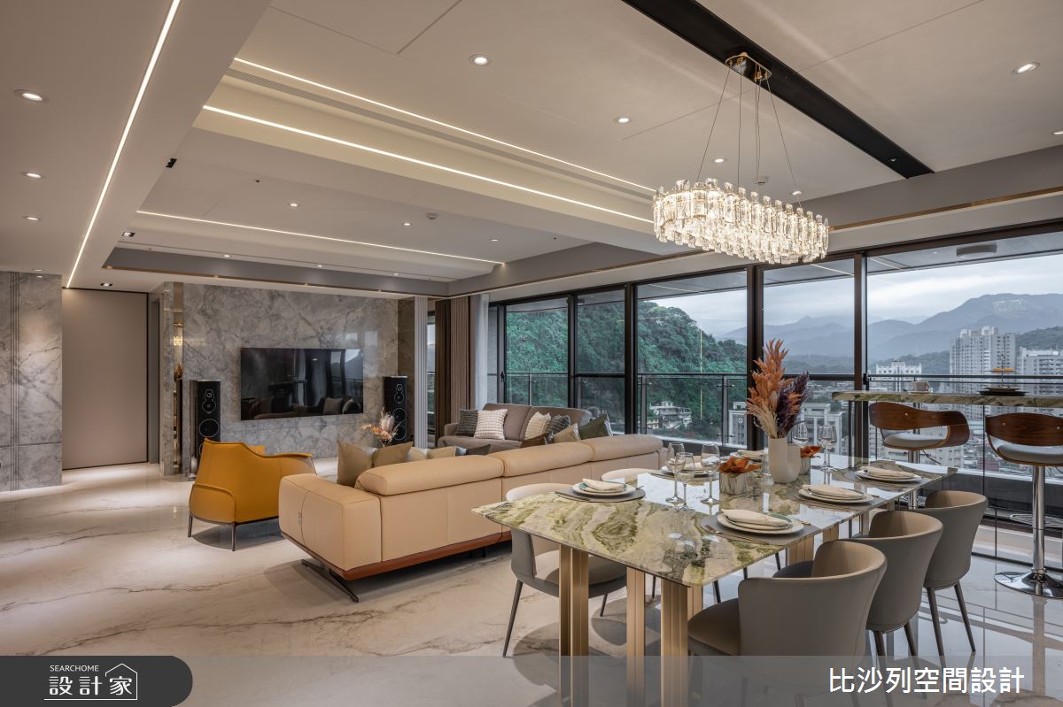 由比沙列空間設計精心規劃的70坪四房住宅空間。因應屋主需求,設計師運用現代風作為主軸,搭配大理石、茶鏡、鍍鈦、鐵件、透光板,打造全家人的夢想家居。