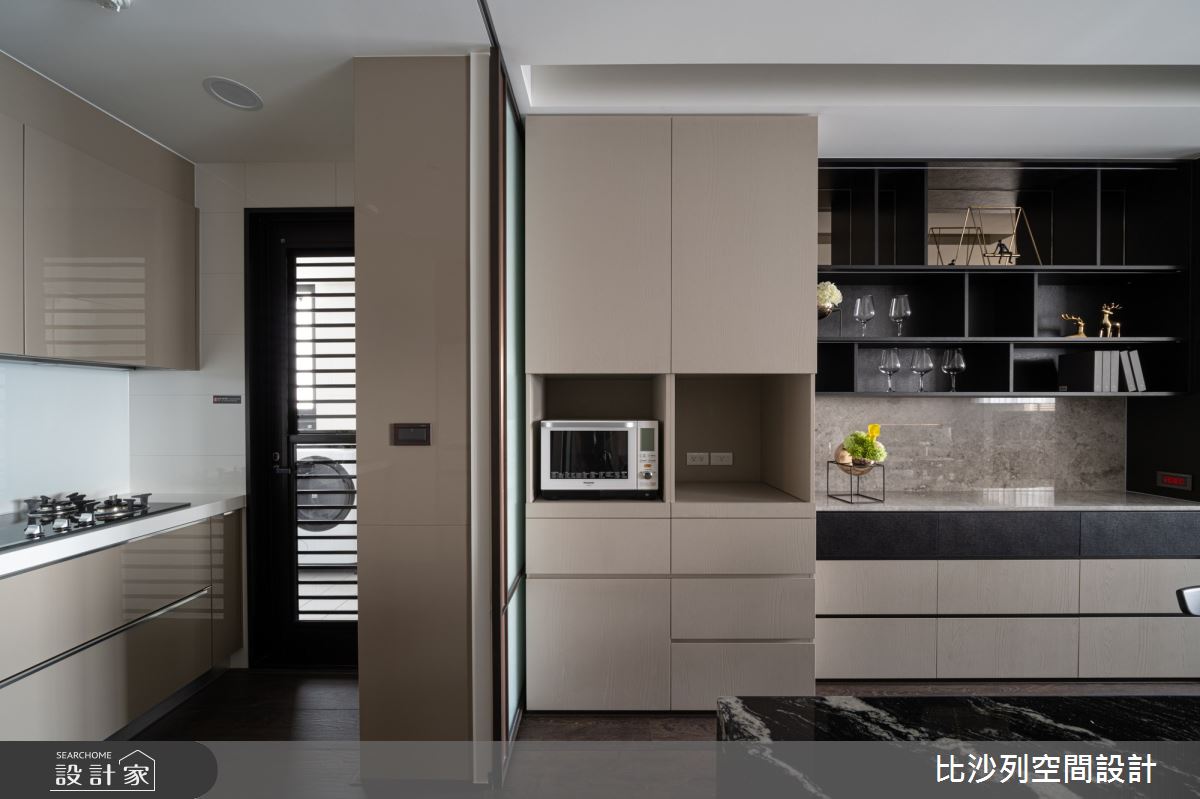 來自比沙列空間設計的75坪現代風住宅案,屋主一家人共有2位大人、2位小孩,是一間單層新成屋(5年以下)的四房格局,設計師藉由建材以茶玻、鍍鈦金屬、烤漆、磁磚、石材的搭配應用,實現一家人的理想生活。
