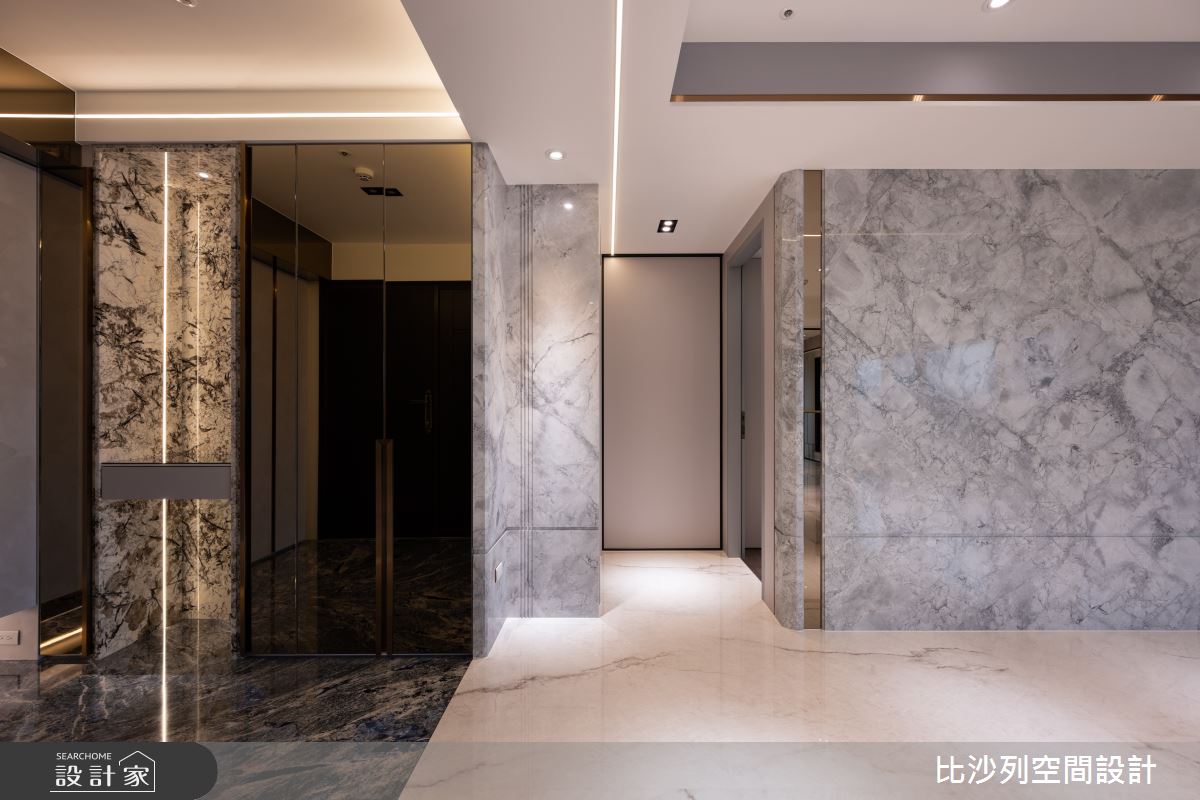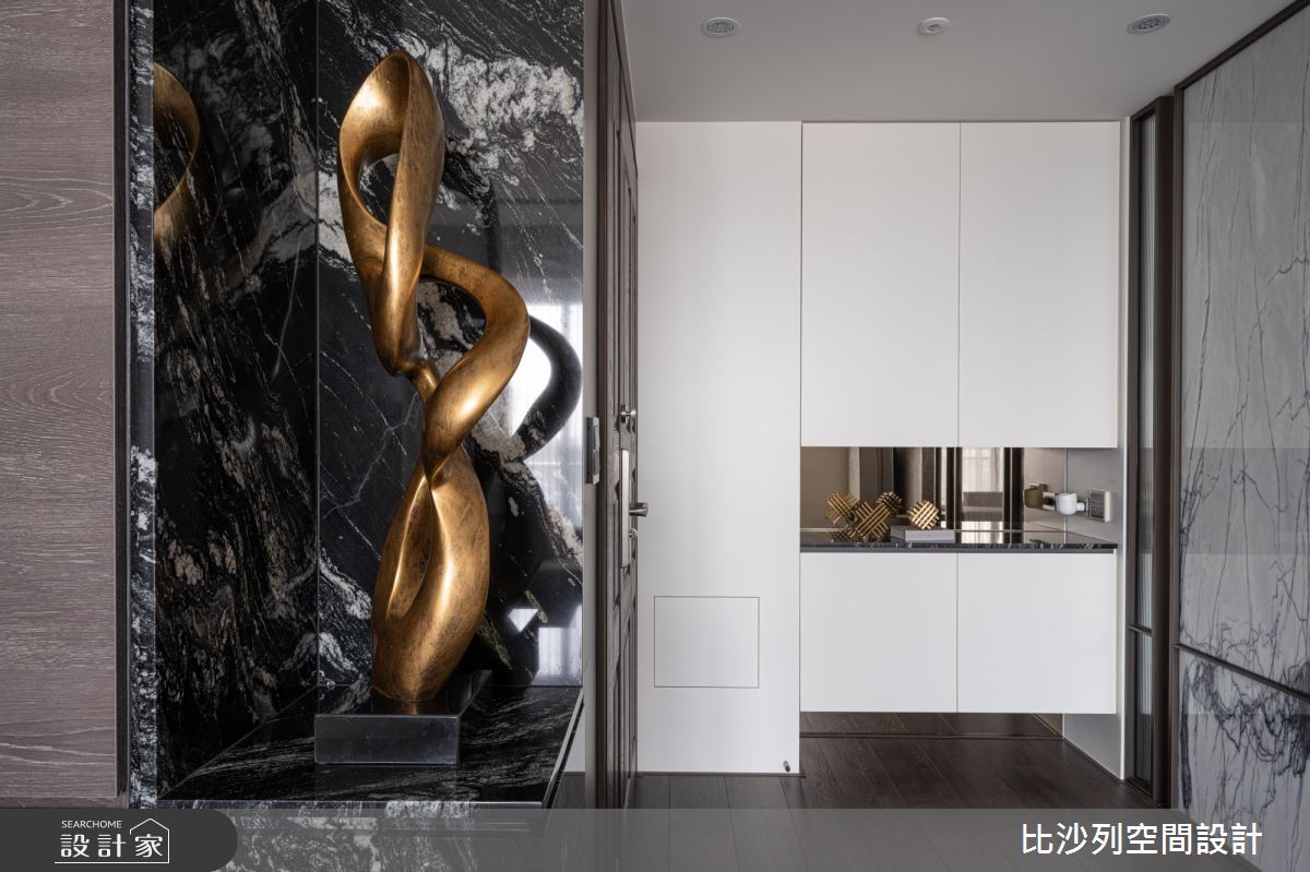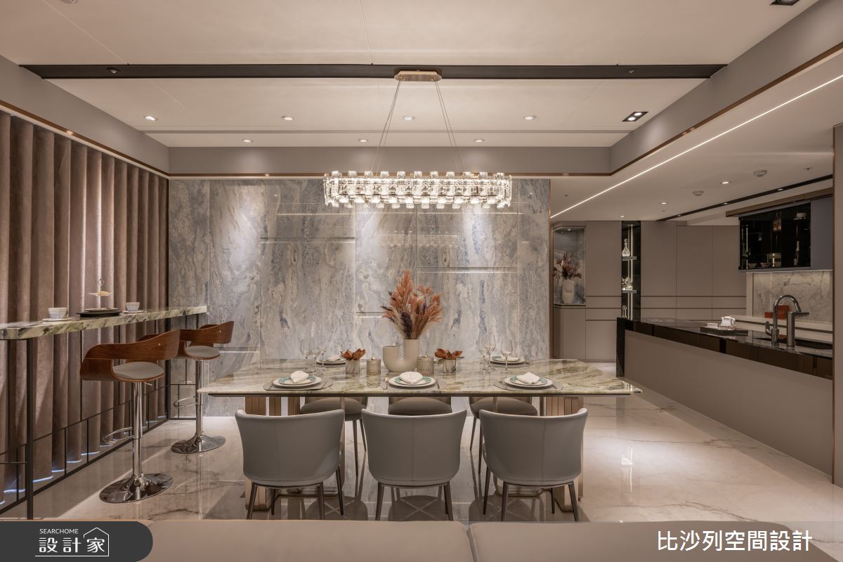 比沙列空間設計以大理石材、鍍鈦金屬的搭配應用,呈現新古典居家氛圍,將此間130坪、四房、單層、新成屋(5年以下)打造成舒適愜意的家庭空間,完成全家人的夢想之居。